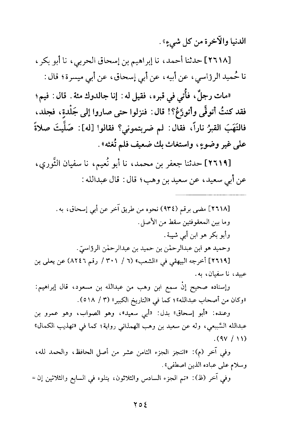 2618 - حَدَّثَنَا أَحْمَدُ، نا إِبْرَاهِيمُ بْنُ إِسْحَاقَ الْحَرْبِيُّ، نا أَبُو بَكْرٍ، نا حُمَيْدٌ الرُّؤَاسِيُّ، عَنْ أَبِيهِ عَنْ أَبِي إِسْحَاقَ، عَنْ أَبِي مَيْسَرَةَ؛ قَالَ: مَاتَ رَجُلٌ، فَأُتِيَ فِي قَبْرِهِ، فَقِيلَ لَهُ: إنا جالدوك مئة. قَالَ: فِيمَ؛ فَقَدْ كُنْتُ أَتَوَقَّى وَأَتَوَرَّعُ؟ ! قَالَ: فَنَزَلُوا حَتَّى صَارُوا إِلَى جَلْدَةٍ، فَجُلِدَ، فَالْتَهَبَ الْقَبْرُ نَارًا، فَقَالَ: لِمَ ضَرَبْتُمُونِي؟ فَقَالُوا لَهُ: صَلَّيتَ صَلاةً عَلَى غَيْرِ وُضُوءٍ، وَاسْتَغَاثَ بِكَ ضَعِيفٌ فَلَمْ تُغِثْهُ.