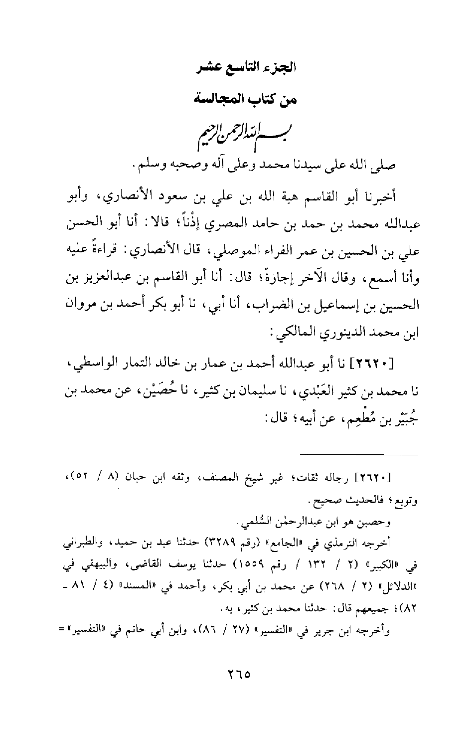 2620 - نا أَبُو عَبْدِ اللهِ أَحْمَدُ بْنُ عَمَّارِ بْنِ خَالِدٍ التَّمَّارُ الْوَاسِطِيُّ، نا مُحَمَّدُ بْنُ كَثِيرٍ الْعَبْدِيُّ، نا سُلَيْمَانُ بْنُ كَثِيرٍ، نا حُصَيْنٌ، عَنْ مُحَمَّدِ بْنِ جُبَيْرِ بْنِ مُطْعِمٍ، عَنْ أَبِيهِ؛ قَالَ: -[266]- انْشَقَّ الْقَمَرُ عَلَى عَهْدِ رَسُولِ اللهِ صَلَّى اللَّهُ عَلَيْهِ وَسَلَّمَ حَتَّى صَارَ فَلْقَتَيْنِ، عَلَى هَذَا الْجَبَلِ، وَعَلَى هَذَا الْجَبَلِ، فَقَالَ النَّاسُ: سَحَرَنَا مُحَمَّدٌ، فَقَالَ بَعْضُهُمْ: إِنْ كَانَ سَحَرَنَا؛ فَإِنَّهُ لا يَسْتَطِيعُ أَنْ يَسْحَرَ النَّاسَ كُلَّهُمْ