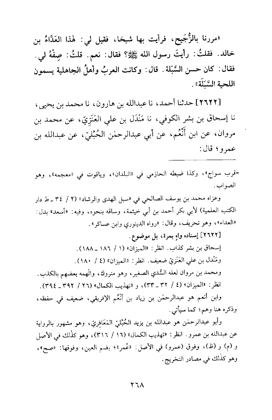 2622 - حَدَّثَنَا أَحْمَدُ، نا عَبْدُ اللهِ بْنُ هَارُونَ، نا مُحَمَّدُ بْنُ يَحْيَى، نا إِسْحَاقُ بْنُ بِشْرٍ الْكُوفِيُّ، نا مَنْدَلُ بْنُ عَلِيٍّ الْعَنْزِيُّ، عَنْ مُحَمَّدِ بْنِ مَرْوَانَ، عَنِ ابْنِ أَنْعُمٍ، عَنْ أَبِي عَبْدِ الرَّحْمَنِ الْحُبُلِيِّ عَنْ عَبْدِ اللهِ بْنِ عَمْرٍو؛ قَالَ: -[269]- قَالَ النَّبِيُّ صَلَّى اللَّهُ عَلَيْهِ وَسَلَّمَ: «مَنْ شَهِدَ إملاك رَجُلٍ مُسْلِمٍ؛ كَانَ كَمَنْ صَامَ يَوْمًا فِي سَبِيلِ اللهِ، وَالْيَوْمُ بسبع مئة يَوْمٍ، وَمَنْ شَهِدَ جَنَازَةَ امْرِئٍ مُسْلِمٍ؛ كَانَ كَمَنْ صَامَ يَوْمًا فِي سَبِيلِ الله، واليوم بسبع مئة يَوْمٍ، وَمَنْ عَادَ مَرِيضًا؛ -[270]- كَانَ كَمَنْ صَامَ يَوْمًا فِي سَبِيلِ اللهِ وَالْيَوْمُ بسبع مئة يَوْمٍ، وَمَنِ اغْتَسَلَ يَوْمَ الْجُمُعَةِ وَشَهِدَ الْجُمُعَةَ؛ كَانَ كَمَنْ صَامَ يَوْمًا فِي سَبِيلِ اللهِ، وَالْيَوْمُ بِسَبْعِ مئة يَوْمٍ»