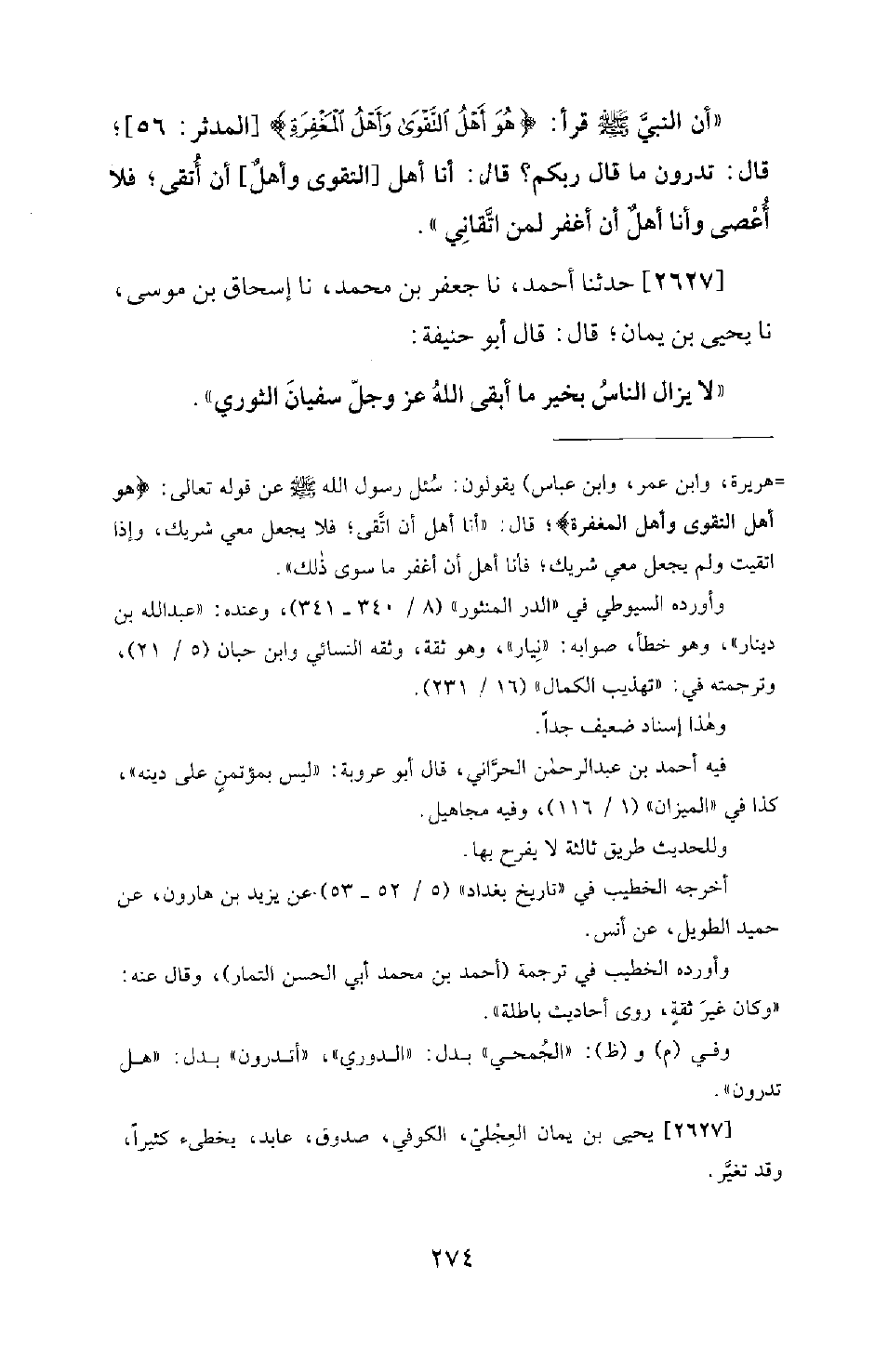 2627 - حَدَّثَنَا أَحْمَدُ، نا جَعْفَرُ بْنُ مُحَمَّدٍ، نا إِسْحَاقُ بْنُ مُوسَى، نا يَحْيَى بْنُ يَمَانٍ؛ قَالَ: قَالَ أَبُو حَنِيفَةَ: لا يَزَالُ النَّاسُ بِخَيْرٍ مَا أَبْقَى الله عَزَّ وَجَلَّ سُفْيَانَ الثَّوْرِيَّ.