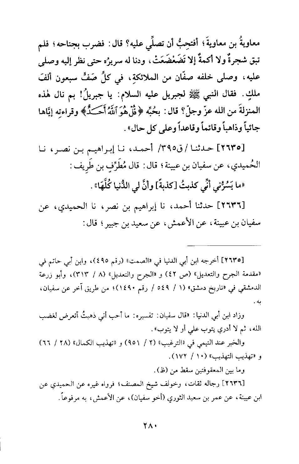 2635 - حَدَّثَنَا أَحْمَدُ، نا إِبْرَاهِيمُ بْنُ نَصْرٍ، نا الْحُمَيْدِيُّ، عَنْ سُفْيَانَ بْنِ عيينة؛ قال: قَالَ مُطَرِّفُ بْنُ طَرِيفٍ: مَا يَسُرُّنِي أَنِّي كَذَبْتُ كَذْبَةً وَأَنَّ لِي الدُّنْيَا كُلَّهَا.