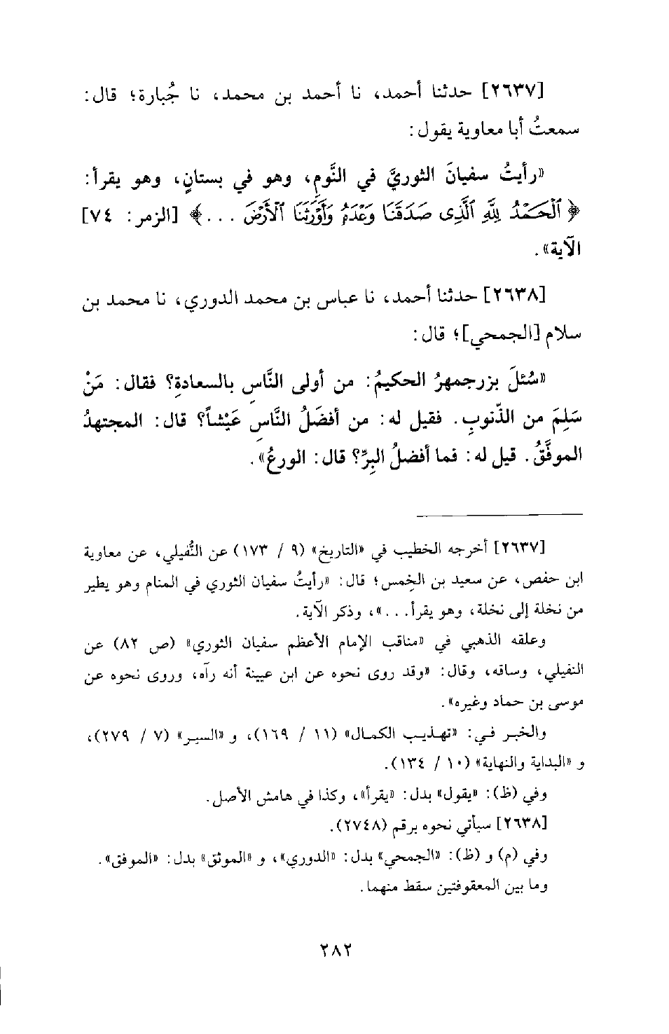 2637 - حَدَّثَنَا أَحْمَدُ، نا أَحْمَدُ بْنُ مُحَمَّدٍ، نا جُبَارَةُ؛ قَالَ: سَمِعْتُ أَبَا مُعَاوِيَةَ يَقُولُ: رَأَيْتُ سُفْيَانَ الثَّوْرِيَّ فِي النَّوْمِ، وَهُوَ فِي بُسْتَانٍ، وَهُوَ يَقْرَأُ: (الْحَمْدُ لِلَّهِ الَّذِي صَدَقَنَا وَعْدَهُ وَأَوْرَثَنَا الأَرْضَ. . .) [الزمر: 74] الآية.