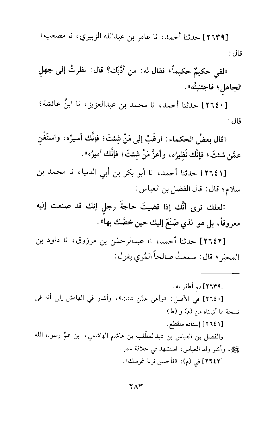 2641 - حَدَّثَنَا أَحْمَدُ، نا أَبُو بَكْرِ بْنُ أَبِي الدُّنْيَا، نا مُحَمَّدُ بْنُ سلام؛ قال: قَالَ الْفَضْلُ بْنُ الْعَبَّاسِ: لَعَلَّكَ تَرَى أَنَّكَ إِذَا قَضَيْتَ حَاجَةَ رَجُلٍ أَنَّكَ قَدْ صَنَعْتَ إِلَيْهِ مَعْرُوفًا؟ ! بل هو الذي صَنَعَ إِلَيْكَ حِينَ خَصَّكَ بِهَا