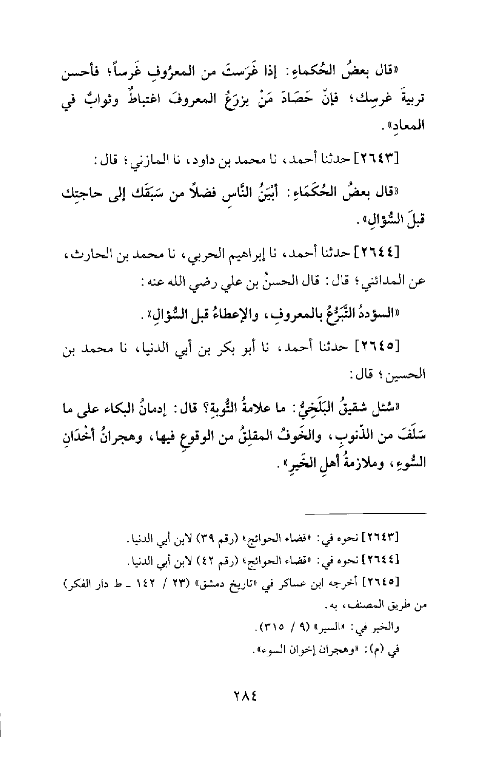 2643 - حَدَّثَنَا أَحْمَدُ، نا مُحَمَّدُ بْنُ دَاوُدَ، نا الْمَازِنِيُّ؛ قَالَ: قَالَ بَعْضُ الْحُكَمَاءِ: أَبْيَنُ النَّاسِ فَضْلا مَنْ سَبَقَكَ إِلَى حَاجَتِكَ قَبْلَ السُّؤَالِ.