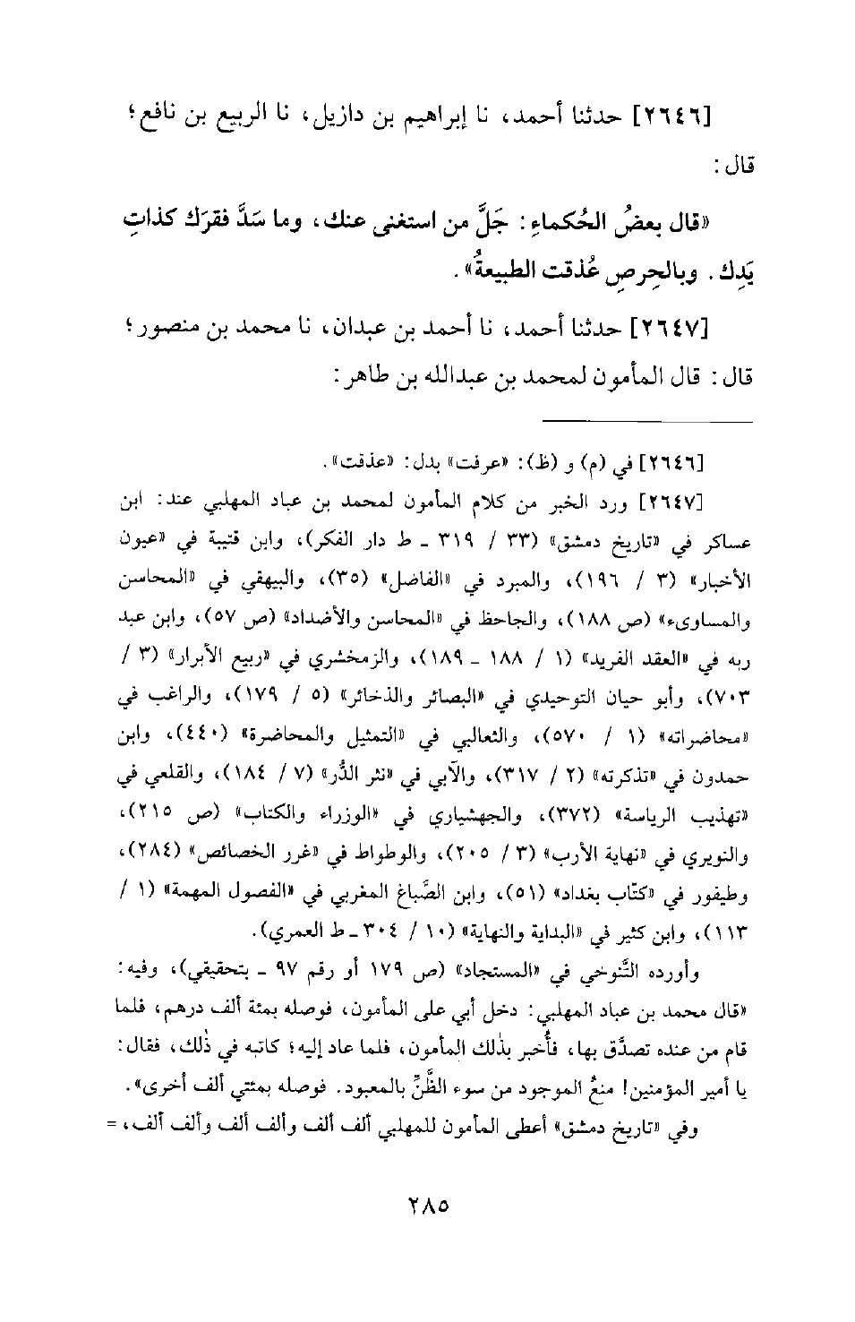 2647 - حَدَّثَنَا أحمد، نا بْنُ عَبْدَانَ، نا مُحَمَّدُ بْنُ مَنْصُورٍ؛ قَالَ: قَالَ الْمَأْمُونُ لِمُحَمَّدِ بْنِ عَبْدِ اللهِ بْنِ طَاهِرٍ: -[286]- بَلَغَنِي أَنَّكَ مِتْلافٌ، فَقَالَ: يَا أَمِيرَ الْمُؤْمِنِينَ! مَنَعَ الْجُودُ سُوءَ الظَّنِّ بِاللهِ عَزَّ وَجَلَّ.