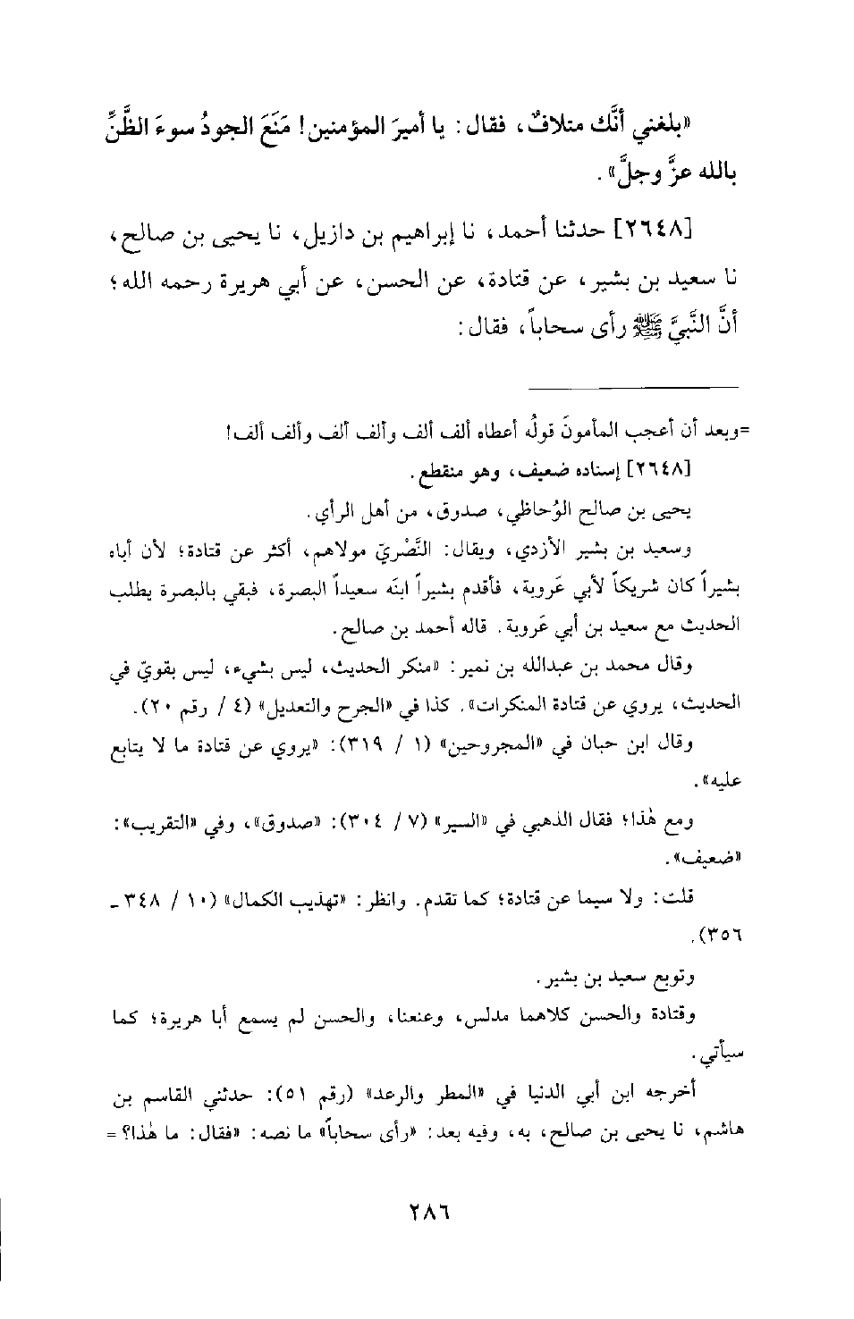 2648 - حَدَّثَنَا أَحْمَدُ، نا إِبْرَاهِيمُ بْنُ دَازِيلَ، نا يحيى بن صالح، ناسعيد بْنُ بَشِيرٍ، عَنْ قَتَادَةَ، عَنِ الْحَسَنِ، عَنْ أَبِي هُرَيْرَةَ رَحِمَهُ اللهُ؛ أَنَّ النَّبِيَّ صَلَّى اللَّهُ عَلَيْهِ وَسَلَّمَ رَأَى سَحَابًا؛ فَقَالَ -[288]-: «رَوَايَا الأَرْضِ يَسُوقُهَا اللهُ عَزَّ وَجَلَّ إِلَى قَوْمٍ لا يَشْكُرُونَهُ وَلا يَذْكُرُونَهُ»