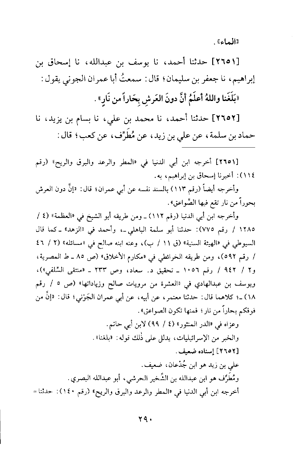 2651 - حَدَّثَنَا أَحْمَدُ، نا يُوسُفُ بْنُ عَبْدِ اللهِ، نا إِسْحَاقُ بْنُ إِبْرَاهِيمَ، نا جَعْفَرُ بْنُ سُلَيْمَانَ؛ قَالَ: سَمِعْتُ أَبَا عِمْرَانَ الْجَوْنِيَّ يَقُولُ: بَلَغَنَا وَاللهُ أَعْلَمُ أَنَّ دُونَ الْعَرْشِ بِحَارًا مِنْ نَارٍ.