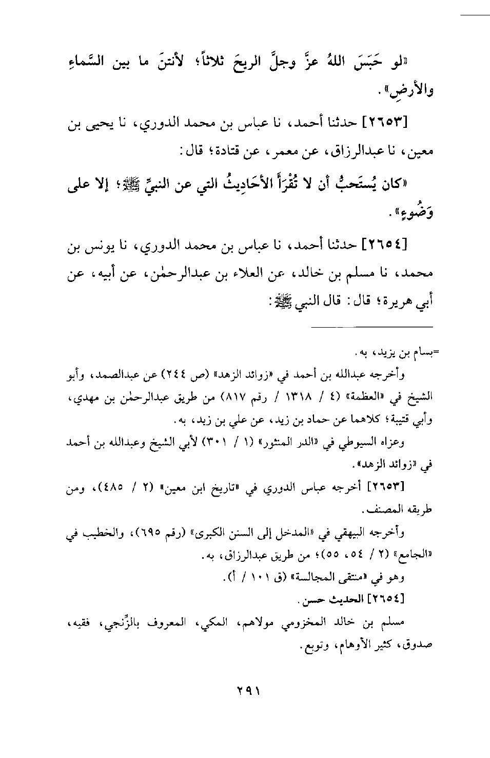 2653 - حَدَّثَنَا أَحْمَدُ، نا عَبَّاسُ بْنُ مُحَمَّدٍ الدُّورِيُّ، نا يَحْيَى بْنُ مَعِينٍ، نا عَبْدُ الرَّزَّاقِ، عَنْ مَعْمَرٍ، عَنْ قَتَادَةَ؛ قَالَ: كَانَ يُسْتَحَبُّ أَنْ لا تُقْرَأَ الأَحَادِيثُ الَّتِي عَنِ النَّبِيِّ صَلَّى اللَّهُ عَلَيْهِ وَسَلَّمَ؛ إِلا عَلَى وُضُوءٍ.
