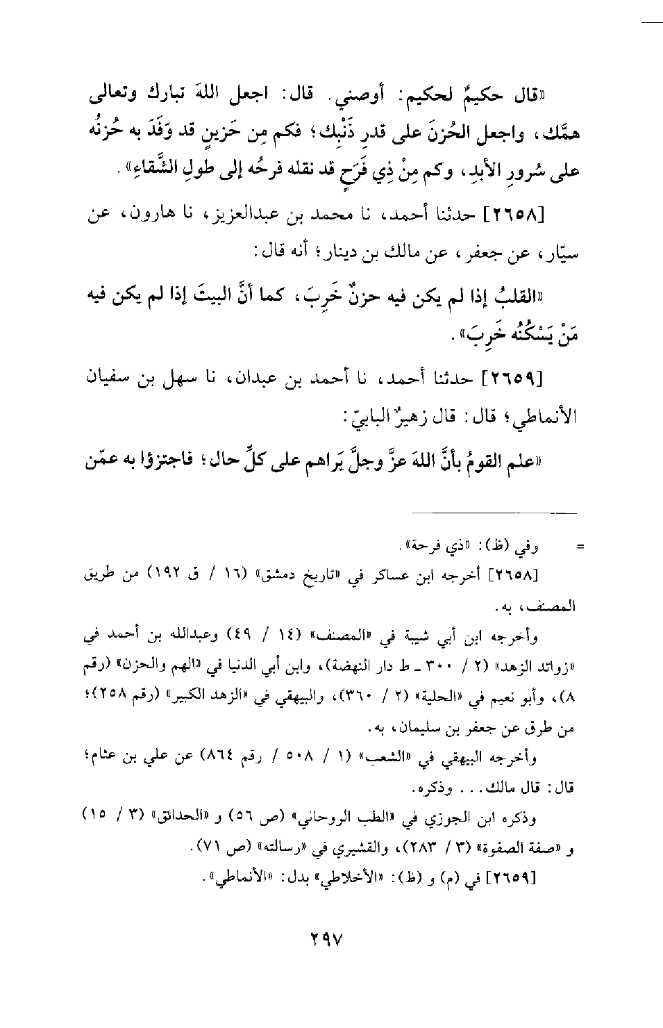 2658 - حَدَّثَنَا أَحْمَدُ، نا مُحَمَّدُ بْنُ عَبْدِ الْعَزِيزِ، نا هَارُونُ، عَنْ سَيَّارٍ، عَنْ جَعْفَرٍ، عَنْ مَالِكِ بْنِ دِينَارٍ؛ أَنَّهُ قَالَ: الْقَلْبُ إِذَا لَمْ يَكُنْ فِيهِ حُزْنٌ خَرِبَ، كَمَا أَنَّ الْبَيْتَ إِذَا لَمْ يَكُنْ فِيهِ مَنْ يَسْكُنُهُ خَرِبَ.