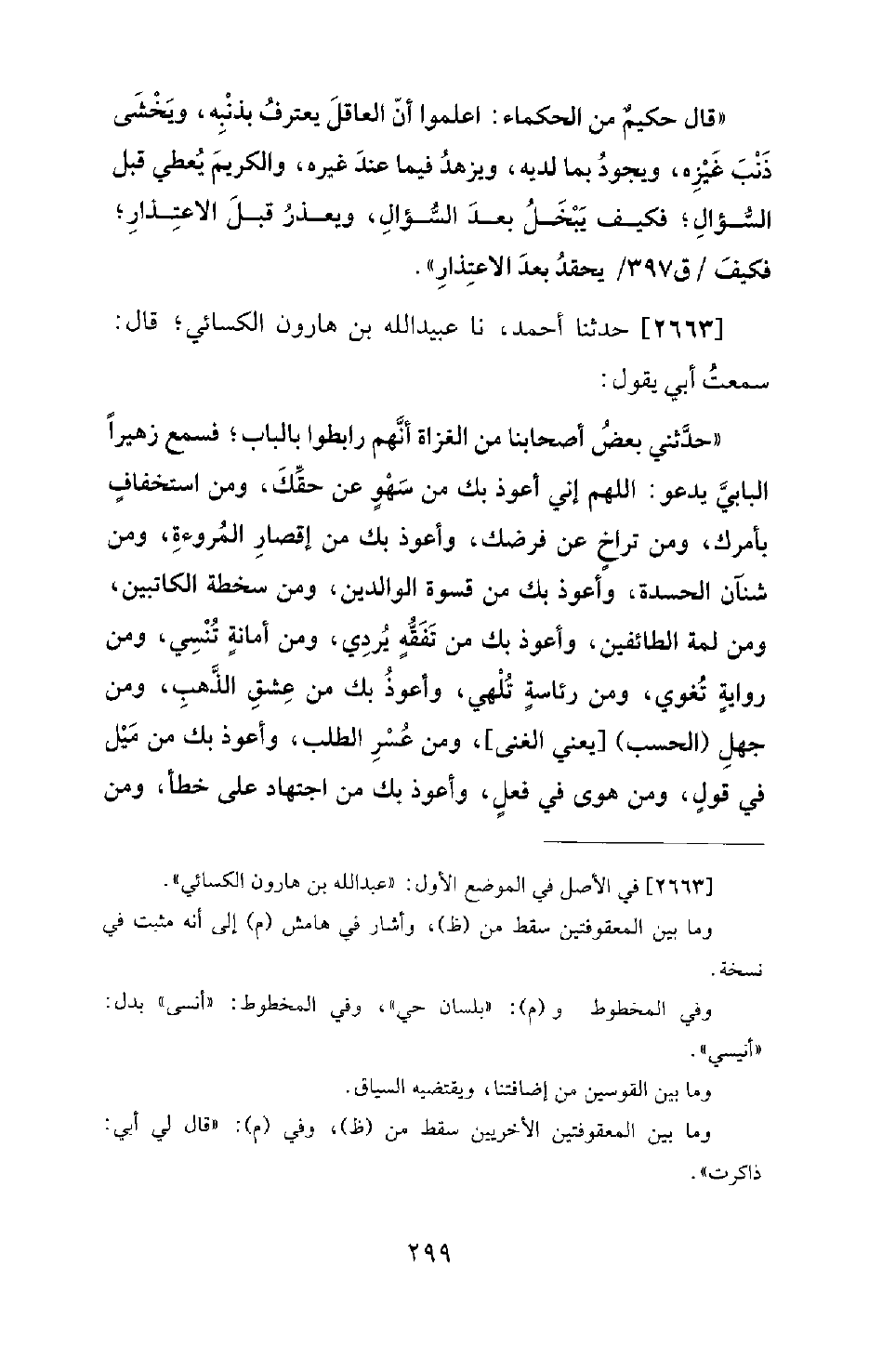 2663 - حَدَّثَنَا أَحْمَدُ، نا عُبَيْدُ اللهِ بْنُ هَارُونَ الْكِسَائِيُّ؛ قَالَ: سَمِعْتُ أَبِي يَقُولُ: حَدَّثَنِي بَعْضُ أَصْحَابِنَا مِنَ الْغُزَاةِ أَنَّهُمْ رَابَطُوا بِالْبَابِ؛ فَسَمِعَ زُهَيْرًا الْبَابِيَّ يَدْعُوُ: اللهُمَّ إِنِّي أعوذ بك من سهوعن حَقِّكَ، وَمِنَ اسْتِخْفَافٍ بِأَمْرِكَ، وَمِنْ تَرَاخٍ عَنْ فَرْضِكَ، وَأَعُوذُ بِكَ مِنْ إِقْصَارِ الْمُرُوءَةِ , وَمِنْ شَنَآنِ الْحَسَدَةِ، وَأَعُوذُ بِكَ مِنْ قَسْوَةِ الْوَالِدَيْنِ، وَمِنْ سَخْطَةِ الْكَاتِبِينَ، وَمِنْ لَمَّةِ الطَّائِفِينَ، وَأَعُوذُ بِكَ مِنْ تَفَقُّهٍ يُرْدِي، وَمِنْ أَمَانَةٍ تُنْسِي، وَمِنْ رِوَايَةٍ تُغْوِي، وَمِنْ رِئَاسَةٍ تُلْهِي، وَأَعُوذُ بِكَ مِنْ عِشْقِ الذَّهَبِ، وَمِنْ جَهْلِ (الْحَسَبِ) يَعْنِي الْغِنَى، وَمِنْ عُسْرِ الطَّلَبِ، وَأَعُوذُ بِكَ مِنْ مَيْلٍ فِي قَوْلٍ، وَمِنْ هَوًى فِي فِعْلٍ، وَأَعُوذُ بِكَ مِنَ اجْتِهَادٍ عَلَى خَطَأٍ، وَمِنْ -[300]- عَمَلٍ عَلَى رِيَاءٍ، وَمِنْ مَحَبَّةِ الدُّنْيَا، وَمِنْ تَعَمُّقِ الأَهْوَاءِ، وَأَعُوذُ بِكَ مِنْ صَرْعَةِ الطَّمَعِ، وَمِنْ خَطْرَةِ الْجَشَعِ، ومن زيغ الْبِدَعِ، وَأَعُوذُ بِكَ مِنْ لِسَانٍ لا يَفِي، وَمِنْ قَلْبٍ لا يَعِي، وَمِنْ أُذُنٍ لا تَسْمَعُ، وَمِنْ نَصِيحَةٍ لا تَنْجَعُ، وَأَعُوذُ بِكَ مِنْ مَوَدَّةٍ لا تُفِيدُ عِلْمًا، وَمِنْ دَعْوَةٍ لا تُنِيلُ غُنْمًا، وَأَسْأَلُكَ مِنَ الْخَيْرِ أَكْثَرَهُ، وَمِنَ الرِّضَا عَنْكَ أَوْفَرَهُ، وَمِنَ الشُّكْرِ مَا هُوَ عِنْدِكَ شُكْرًا، وَمِنَ الثَّنَاءِ عَلَيْكَ مَا هُوَ عِنْدِكَ ذِكْرًا، وَأَسْأَلُكَ لِسَانًا لا يُخَالِفُ قَلْبَهُ، وَعِلْمًا لا يُفَارِقُ قَوْلَهُ، بَعْضُهُ يُشْبِهُ بَعْضًا، يُقِيمَانِ لَكَ كُلَّ سَعْيٍ فَرْضًا، وَأَسْأَلُكَ قُنُوعًا بِمَا رَزَقْتَنِي، وَرِضًا بِمَا يَنْزِلُ بِي، وَصَبْرًا عَلَى أَمْرِكَ، وَرِضًا بِحُكْمِكَ، وَحُبًّا لَكَ يَزِيدُنِي قُرْبًا مِنْكَ، وَمُجَالَسَةً لَكَ تَجْعَلُنِي أَنِيسًا لَكَ، وَتُنْطِقُنِي بِلِسَانٍ حَيِيٍّ، وَفَهِّمْنِي فَهْمَ مَنْ آثَرَكَ عَلَى نَفْسِهِ، وَعَلِّمْنِي عِلْمَ مَنِ ائْتَمَنَكَ عَلَى أَمْرِهِ، وَكُنْ أَنِيسِي. قَالَ عَبْدُ اللهِ بْنُ هَارُونَ الْكِسَائِيُّ: قَالَ لِي أَبِي: إِنِّي ذَاكَرْتُ بهَذَا بِشْرَ بْنَ الْحَارِثِ؛ فَقَبَضَ عَلَى يَدِي وَقَالَ: لا أُفَارِقُكَ حَتَّى تُمْلِيهِ عَلَيَّ؛ فَإِنَّمَا هَذَا دُعَاءٌ أَنْطَقَ اللهُ بِهِ زُهَيْرًا.
