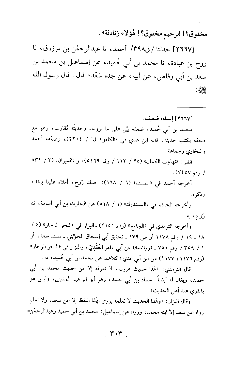 2667 - حَدَّثَنَا أَحْمَدُ، نا عَبْدُ الرَّحْمَنِ بْنُ مَرْزُوقٍ، نا رَوْحُ بْنُ عُبَادَةَ، نا مُحَمَّدُ بْنُ أَبِي حُمَيْدٍ، عَنْ إِسْمَاعِيلَ بْنِ مُحَمَّدِ بْنِ سَعْدِ بْنِ أَبِي وَقَّاصٍ، عَنْ أَبِيهِ، عَنْ جَدِّهِ سَعْدٍ؛ قَالَ: قَالَ رَسُولُ اللهِ -[304]- صَلَّى اللَّهُ عَلَيْهِ وَسَلَّمَ: «مِنْ سَعَادَةِ ابْنِ آدَمَ اسْتِخَارَةُ اللهِ عَزَّ وَجَلَّ، وَمِنْ شِقْوَةِ ابْنِ آدَمَ تَرْكُهُ اسْتِخَارَةِ اللهِ عَزَّ وَجَلَّ»