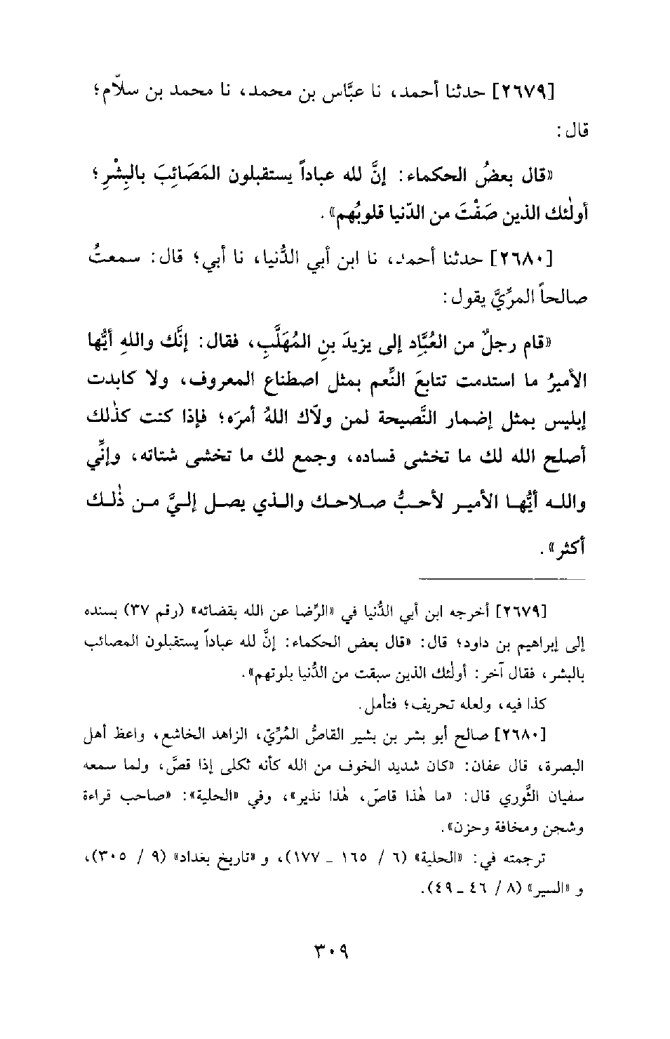 2680 - حَدَّثَنَا أَحْمَدُ، نا ابْنُ أَبِي الدُّنْيَا، نا أَبِي؛ قَالَ: سَمِعْتُ صَالِحًا الْمُرِّيَّ يَقُولُ: قَامَ رَجُلٌ مِنَ الْعُبَّادِ إِلَى يَزِيدَ بْنِ الْمُهَلَّبِ، فَقَالَ: إِنَّكَ وَاللهِ أَيُّهَا الأَمِيرُ مَا اسْتَدَمْتَ تَتَابُعَ النِّعَمِ بِمِثْلِ اصْطِنَاعِ الْمَعْرُوفِ، وَلا كَابَدْتَ إِبْلِيسَ بِمِثْلِ إِضْمَارِ النَّصِيحَةِ لِمَنْ وَلاكَ اللهُ أَمْرَهُ؛ فَإِذَا كُنْتَ كَذَلِكَ أَصْلَحَ اللهُ لَكَ مَا تَخْشَى فَسَادَهُ، وَجَمَعَ لَكَ مَا تَخْشَى شَتَاتَهُ، وَإِنِّي وَاللهِ أَيُّهَا الأَمِيرُ لأُحِبُّ صَلاحَكَ، وَالَّذِي يَصِلُ إِليَّ مِنْ ذَلِكَ أَكْثَرُ.