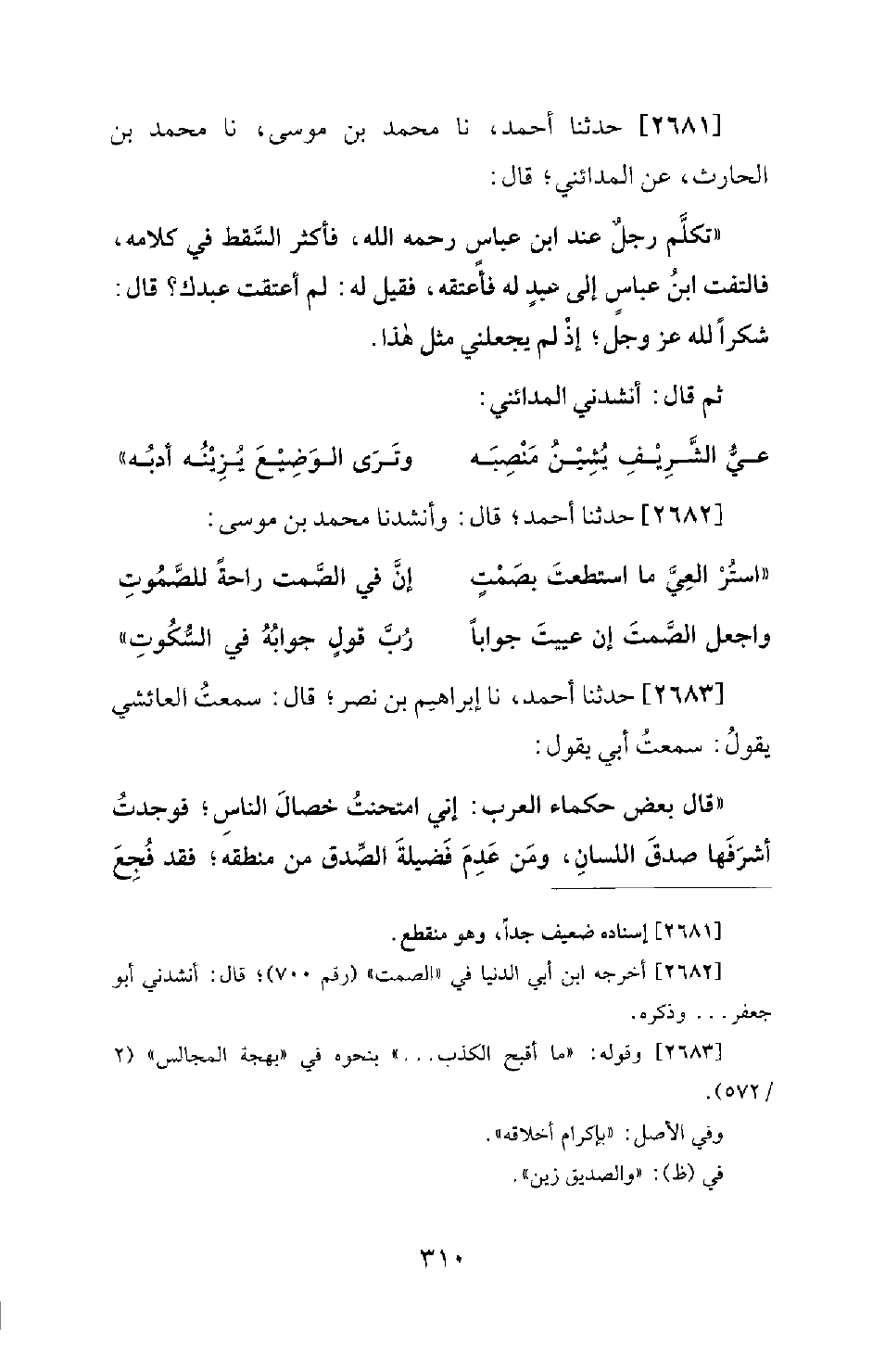 2681 - حَدَّثَنَا أَحْمَدُ، نا مُحَمَّدُ بْنُ مُوسَى، نا مُحَمَّدُ بْنُ الْحَارِثِ، عَنِ الْمَدَائِنِيِّ؛ قَالَ: تكلم رجل عند ابْنِ عَبَّاسٍ رَحِمَهُ اللهُ، فَأَكْثَرَ السَّقْطَ فِي كَلامِهِ، فالتفت ابْنُ عَبَّاسٍ إِلَى عَبْدٍ لَهُ فَأَعْتَقَهُ، فَقِيلَ لَهُ: لِمَ أَعْتَقْتَ عَبْدَكَ؟ قَالَ: شُكْرًا لِلَّهِ عَزَّ وَجَلَّ؛ إِذْ لَمْ يَجْعَلْنِي مِثْلَ هَذَا. ثُمَّ قَالَ: أَنْشَدَنِي الْمَدَائِنِيُّ: