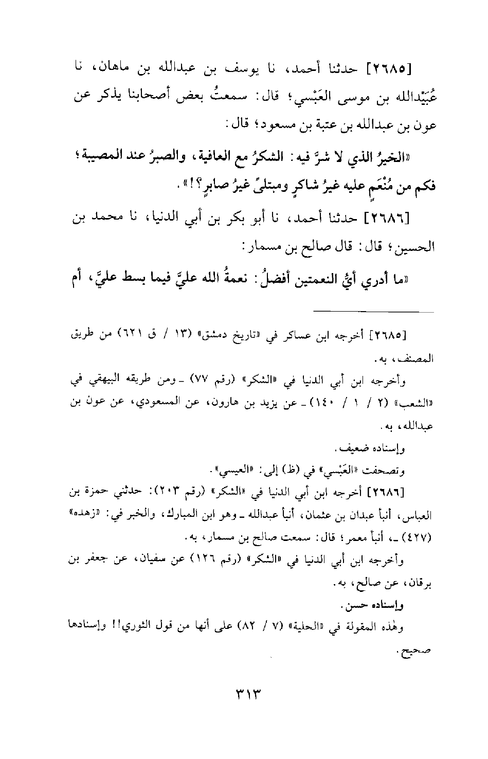 2685 - حَدَّثَنَا أَحْمَدُ، نا يُوسُفُ بْنُ عَبْدِ اللهِ بْنِ مَاهَانَ، نا عُبَيْدُ اللهِ بْنُ مُوسَى الْعَبْسِيُّ؛ قَالَ: سَمِعْتُ بَعْضَ أَصْحَابِنَا يَذْكُرُ عَنْ عَوْنِ بْنِ عَبْدِ اللهِ بْنِ عُتْبَةَ بْنِ مَسْعُودٍ؛ قَالَ: الْخَيْرُ الَّذِي لا شَرَّ فِيهِ: الشُّكْرُ مَعَ الْعَافِيَةِ، وَالصَّبْرُ عِنْدَ الْمُصِيبَةِ؛ فَكَمْ مِنْ مُنْعَمٍ عَلَيْهِ غَيْرِ شَاكِرٍ، وَمُبْتَلًى غَيْرِ صَابِرٍ؟ !