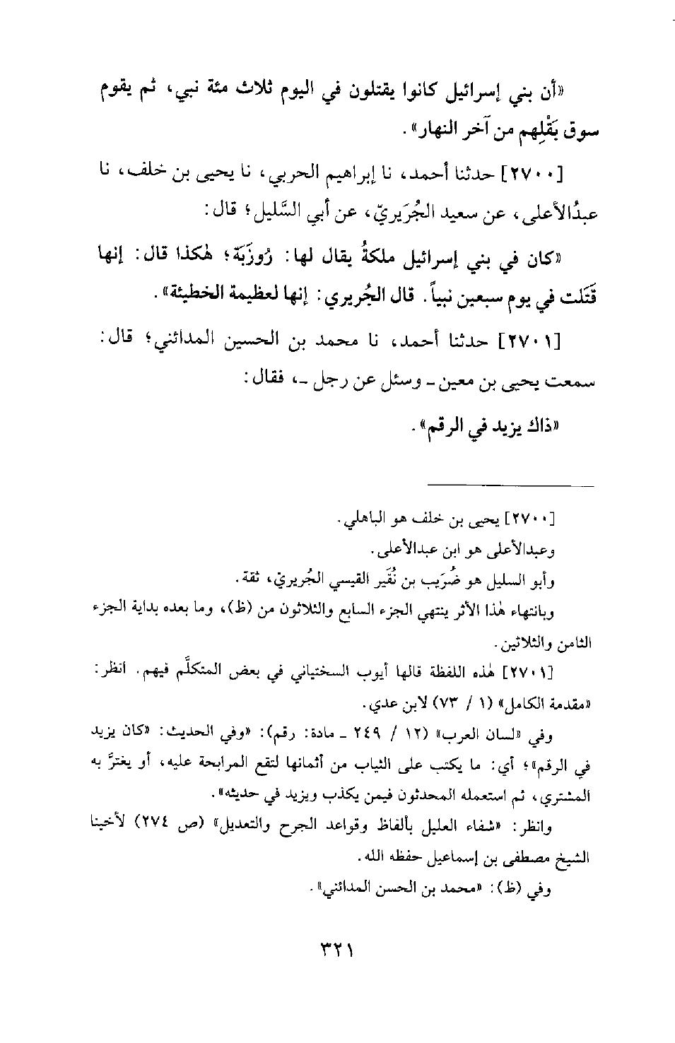 2700 - حَدَّثَنَا أَحْمَدُ، نا إِبْرَاهِيمُ الْحَرْبِيُّ؛ نا يَحْيَى بْنُ خَلَفٍ، نا عَبْدُ الأَعْلَى، عَنْ سَعِيدٍ الْجُرَيْرِيِّ، عَنْ أَبِي السَّلِيلِ؛ قَالَ: كَانَ فِي بَنِي إِسْرَائِيلَ مَلِكَةٌ يُقَالُ لها: روزبة؛ هَكَذَا، قَالَ: إِنَّهَا قَتَلَتْ فِي يَوْمٍ سَبْعِينَ نَبِيًّا. قَالَ الْجُرَيْرِيُّ: إِنَّهَا لَعَظِيمَةُ الْخَطِيئَةِ.