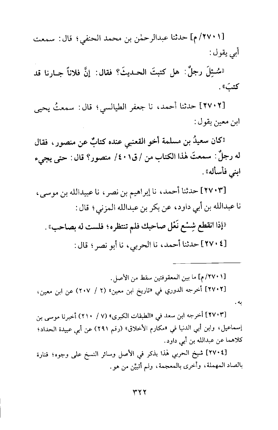 2702 - حَدَّثَنَا أَحْمَدُ، نا جَعْفَرٌ الطَّيَالِسِيُّ؛ قَالَ: سَمِعْتُ يَحْيَى بْنَ مَعِينٍ يَقُولُ: كَانَ سَعِيدُ بْنُ مَسْلَمَةَ أَخُو الْقَعْنَبِيِّ عِنْدَهُ كِتَابٌ عَنْ مَنْصُورٍ، فَقَالَ لَهُ رَجُلٌ: سَمِعْتَ هَذَا الْكِتَابَ مِنْ مَنْصُورٍ؟ قَالَ: حَتَّى يَجِيءَ ابْنِي فأسأله.