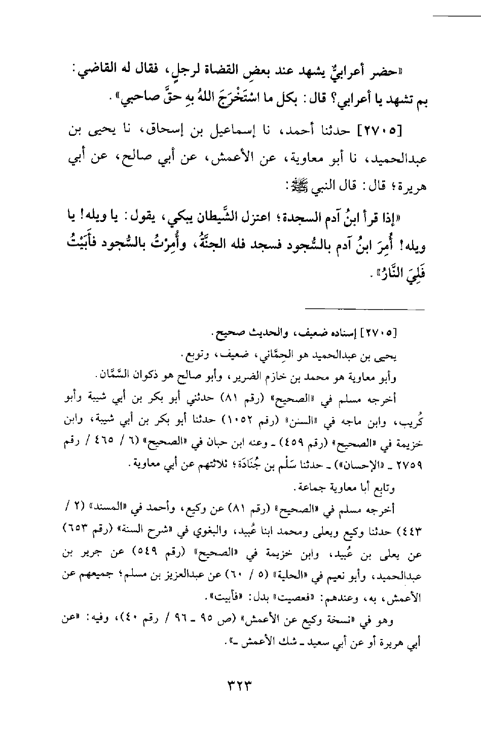 2705 - حَدَّثَنَا أَحْمَدُ، نا إِسْمَاعِيلُ بْنُ إِسْحَاقَ، نا يَحْيَى بْنُ عَبْدِ الْحَمِيدِ، نا أَبُو مُعَاوِيَةَ، عَنِ الأَعْمَشِ، عَنْ أَبِي صَالِحٍ، عَنْ أَبِي هُرَيْرَةَ؛ قَالَ: قَالَ النَّبِيُّ صَلَّى اللَّهُ عَلَيْهِ وَسَلَّمَ: «إِذَا قَرَأَ ابْنُ آدَمَ السَّجْدَةَ؛ اعْتَزَلَ الشَّيْطَانُ يَبْكِي، يَقُولُ: يَا وَيْلَهُ! يَا وَيْلَهُ! أُمِرَ ابْنُ آدَمَ بِالسُّجُودِ فَسَجَدَ فَلَهُ الْجَنَّةُ، وَأُمِرْتُ بِالسُّجُودِ فَأَبَيْتُ فَلِيَ النَّارُ»