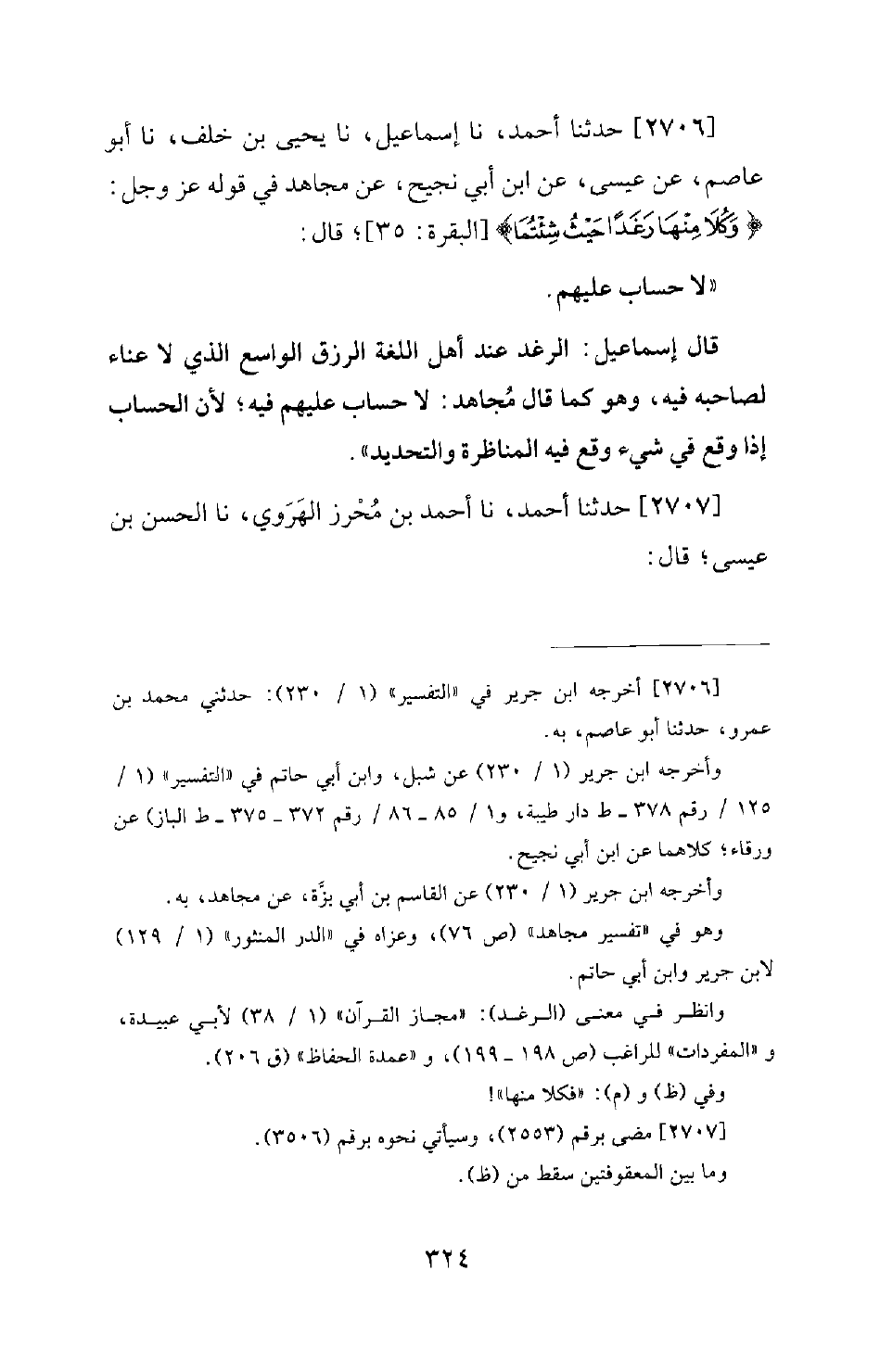 2706 - حَدَّثَنَا أَحْمَدُ، نا إِسْمَاعِيلُ، نا يَحْيَى بْنُ خَلَفٍ، نا أَبُو عَاصِمٍ، عَنْ عِيسَى، عَنِ ابْنِ أَبِي نَجِيحٍ، عَنْ مُجَاهِدٍ فِي قَوْلِهِ عَزَّ وَجَلَّ: {وَكُلا مِنْهَا رغدا حيث شئتما} [البقرة: 35] ؛ قَالَ: لا حِسَابَ عَلَيْهِمْ. قَالَ إِسْمَاعِيلُ: الرَّغَدُ عِنْدَ أَهْلِ اللُّغَةِ: الرِّزْقُ الْوَاسِعُ الَّذِي لا عَنَاءَ لِصَاحِبِهِ فِيهِ، وَهُوَ كَمَا قَالَ مُجَاهِدٌ: لا حِسَابَ عَلَيْهِمْ فِيهِ؛ لأَنَّ الْحِسَابَ إِذَا وَقَعَ فِي شَيْءٍ وَقَعَ فِيهِ الْمُنَاظَرَةُ وَالتَّحْدِيدُ.