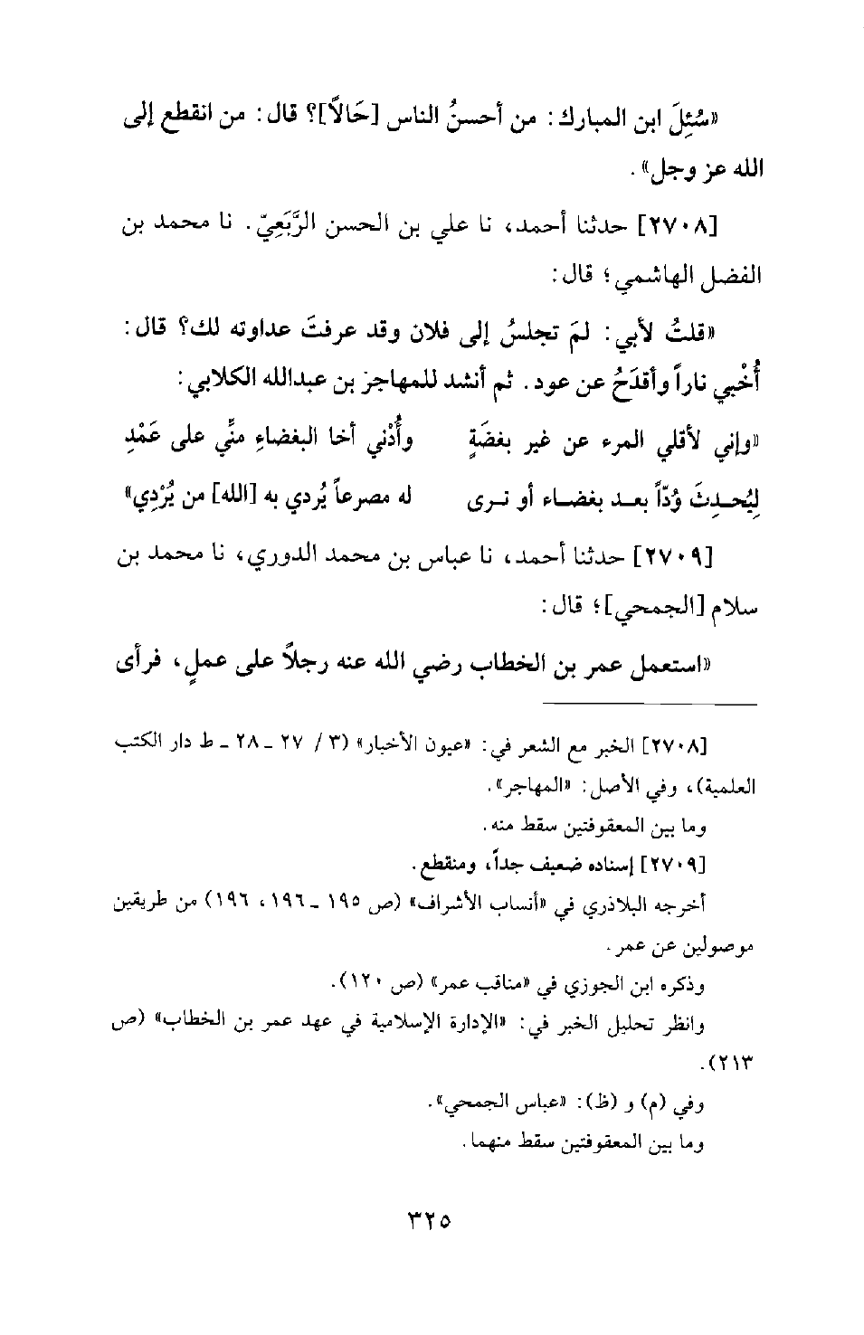 2709 - حَدَّثَنَا أَحْمَدُ، نا عَبَّاسُ بْنُ مُحَمَّدٍ الدُّورِيُّ، نا مُحَمَّدُ بْنُ سَلامٍ الْجُمَحِيُّ؛ قَالَ: اسْتَعْمَلَ عُمَرُ بْنُ الْخَطَّابِ رَضِيَ اللهُ عَنْهُ رَجُلا عَلَى عَمَلٍ، فَرَأَى -[326]- عُمَرَ رَضِيَ اللهُ عَنْهُ يُقَبِّلُ صَبِيًّا لَهُ، فَقَالَ: تُقَبِّلُهُ وَأَنْتَ أَمِيرُ الْمُؤْمِنِينَ؟ ! لَوْ كُنْتُ أَنَا مَا فَعَلْتُهُ. فَقَالَ عُمَرُ رَضِيَ اللهُ عَنْهُ: فَمَا ذَنْبِي إِنْ كَانَ قَدْ نُزِعَ مِنْ قَلْبِكَ الرَّحْمَةُ؟ ! إِنَّ اللهَ لا يَرْحَمُ مِنْ عِبَادِهِ إِلا الرُّحَمَاءَ. قَالَ: وَنَزَعَهُ عَنْ عَمَلِهِ، وَقَالَ: أَنْتَ لا تَرْحَمُ وَلَدَكَ؛ فَكَيْفَ تَرْحَمُ النَّاسَ؟ !