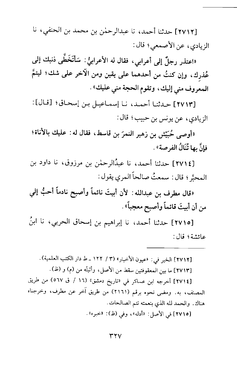2713 - حَدَّثَنَا أَحْمَدُ، نا إِسْمَاعِيلُ بْنُ إِسْحَاقَ؛ قَالَ الزِّيَادِيُّ: عَنْ يُونُسَ بْنِ حَبِيبٍ؛ قَالَ: أَوْصَى حُبَيْشُ بْنُ زُهَيْرٍ النَّمِرَ بْنَ قَاسِطٍ، فَقَالَ لَهُ: عَلَيْكَ بِالأَنَاةِ؛ فَإِنَّ بِهَا تُنَالُ الْفُرْصَةُ