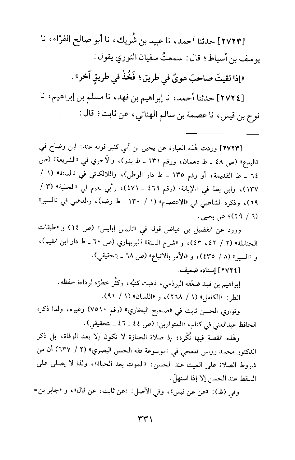 2723 - حَدَّثَنَا أَحْمَدُ، نا عُبَيْدُ بْنُ شَرِيكٍ، نا أَبُو صَالِحٍ الْفَرَّاءُ، نا يُوسُفُ بْنُ أَسْبَاطٍ؛ قَالَ: سَمِعْتُ سُفْيَانَ الثَّوْرِيَّ يَقُولُ: إِذَا لَقِيتَ صَاحِبَ هَوًى فِي طَرِيقٍ؛ فَخُذْ فِي طَرِيقٍ آخَرَ.