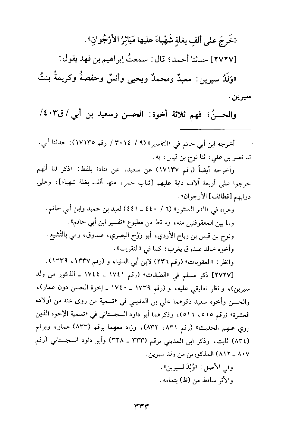 2727 - حَدَّثَنَا أَحْمَدُ؛ قَالَ: سَمِعْتُ إِبْرَاهِيمَ بْنَ فَهْدٍ يَقُولُ: وَلَدُ سِيرِينَ: مَعْبَدٌ وَمُحَمَّدٌ وَيَحْيَى وَأَنَسٌ وَحَفْصَةُ وَكَرِيمَةُ بِنْتُ سِيرِينَ. وَالْحَسَنُ؛ فَهُمْ ثَلاثَةُ أُخْوَةٍ: الْحَسَنُ وَسَعِيدُ بْنُ أَبِي -[334]- الْحَسَنِ وَعَمَّارُ بْنُ أَبِي الْحَسَنِ.