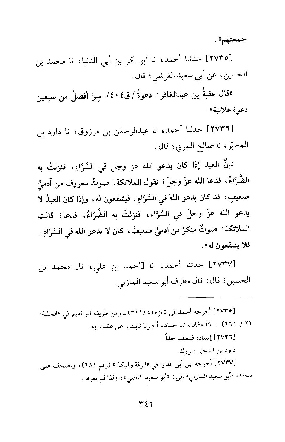 2735 - حَدَّثَنَا أَحْمَدُ، نا أَبُو بَكْرِ بْنُ أَبِي الدُّنْيَا، نا مُحَمَّدُ بْنُ الْحُسَيْنِ، عَنْ أَبِي سَعِيدٍ الْقُرَشِيِّ؛ قَالَ: قَالَ عُقْبَةُ بْنُ عَبْدِ الْغَافِرِ: دَعْوَةُ سِرٍّ أَفْضَلُ مِنْ سَبْعِينَ دَعْوَةَ عَلانِيَّةٍ.