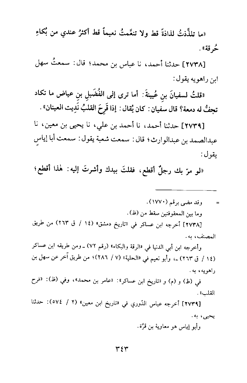 2738 - حَدَّثَنَا أَحْمَدُ، نا عَبَّاسُ بْنُ مُحَمَّدٍ؛ قَالَ: سَمِعْتُ سَهْلَ بْنَ رَاهَوَيْهِ يَقُولُ: قُلْتُ لِسُفْيَانَ بْنِ عُيَيْنَةَ: أَمَا تَرَى إِلَى الْفُضَيْلِ بْنِ عِيَاضٍ مَا تَكَادُ تَجِفُّ لَهُ دَمْعَةٌ؟ قَالَ سُفْيَانُ: كَانَ يُقَالُ: إِذَا قَرَحَ الْقَلْبُ نَدِيَتِ الْعَيْنَانِ.