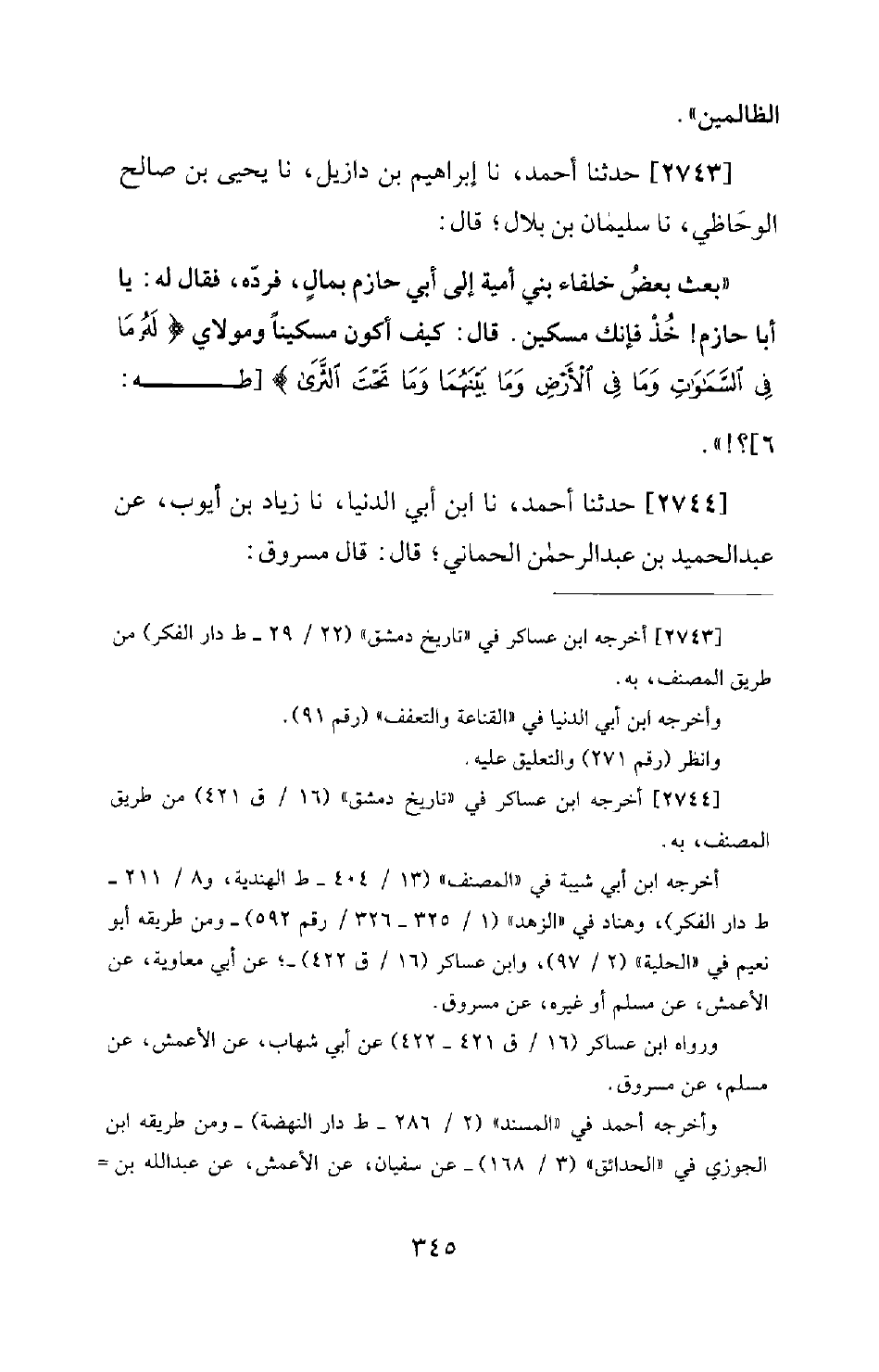 2743 - حَدَّثَنَا أَحْمَدُ، نا إِبْرَاهِيمُ بْنُ دَازِيلَ، نا يَحْيَى بْنُ صَالِحٍ الْوُحَاظِيُّ، نا سُلَيْمَانُ بْنُ بِلالٍ؛ قَالَ بَعَثَ بَعْضُ خُلَفَاءِ بَنِي أُمَيَّةَ إِلَى أَبِي حَازِمٍ بِمَالٍ، فَرَدَّهُ، فَقَالَ لَهُ: يَا أَبَا حَازِمٍ! خُذْ فَإِنَّكَ مِسْكِينٌ. قَالَ: كَيْفَ أَكُونُ مِسْكِينًا وَمَوْلايَ (لَهُ مَا فِي السَّمَاواتِ وَمَا فِي الأَرْضِ وَمَا بَيْنَهُمَا وَمَا تَحْتَ الثَّرَى (6)) [طه: 6] ؟ !