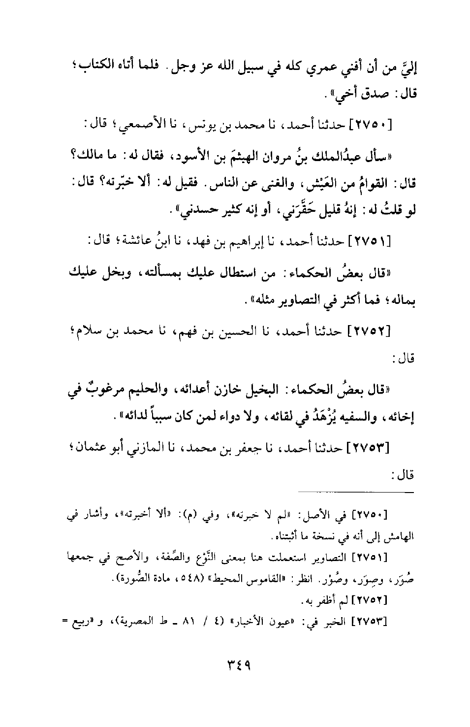 2752 - حَدَّثَنَا أَحْمَدُ، نا الْحُسَيْنُ بْنُ فَهْمٍ، نا مُحَمَّدُ بْنُ سَلامٍ؛ قَالَ: قَالَ بَعْضُ الْحُكَمَاءِ: الْبَخِيلُ خَازِنُ أَعْدَائِهِ، وَالْحَلِيمُ مَرْغُوبٌ فِي إِخَائِهِ، وَالسَّفِيهُ يُزْهَدُ فِي لِقَائِهِ، وَلا دَوَاءَ لِمَنْ كَانَ سَبَبًا لِدَائِهِ.