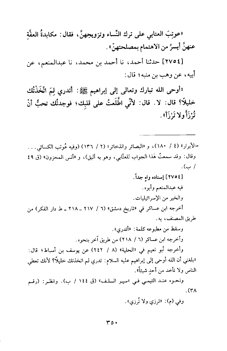 2754 - حَدَّثَنَا أَحْمَدُ، نا أَحْمَدُ بْنُ مُحَمَّدٍ، نا عَبْدُ الْمُنْعِمِ، عَنْ أَبِيهِ، عَنْ وَهْبِ بْنِ مُنَبِّهٍ؛ قَالَ: أَوْحَى اللهُ تَبَارَكَ وَتَعَالَى إِلَى إِبْرَاهِيمَ [صَلَّى اللَّهُ عَلَيْهِ وَسَلَّمَ] : أَتَدْرِي لِمَ اتَّخَذْتُكَ خَلِيلا؟ قَالَ: لا. قَالَ: لأَنِّي اطَّلَعْتُ عَلَى قَلْبِكَ. فَوَجَدْتُكَ تُحِبُّ أَنْ تُرْزَأَ وَلا تَرْزَأَ