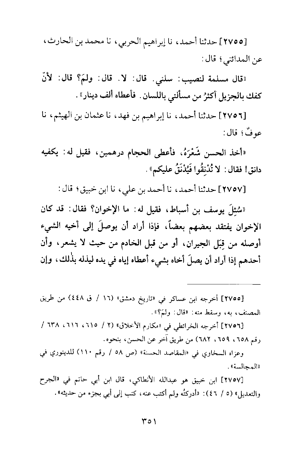 2755 - حَدَّثَنَا أَحْمَدُ، نا إِبْرَاهِيمُ الْحَرْبِيُّ، نا مُحَمَّدُ بْنُ الْحَارِثِ، عَنِ المدائني؛ قال: قَالَ مَسْلَمَةُ لِنُصَيْبٍ: سَلْنِي. قَالَ: لا. قَالَ: وَلِمَ؟ قَالَ: لأَنَّ كَفَّكَ بِالْجَزِيلِ أَكْثَرُ مِنْ مَسْأَلَتِي بِاللِّسَانِ. فَأَعْطَاهُ أَلْفَ دِينَارٍ.