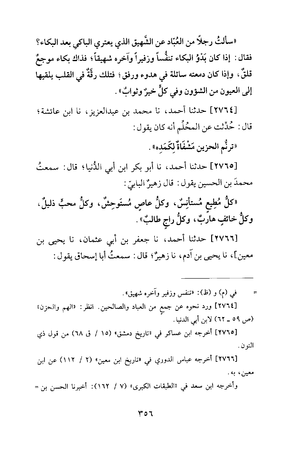 2764 - حَدَّثَنَا أَحْمَدُ، نا مُحَمَّدُ بْنُ عَبْدِ الْعَزِيزِ، نا ابْنُ عَائِشَةَ؛ قَالَ: حُدِّثْتُ عَنِ الْمحُلِّمِ أَنَّهُ كَانَ يَقُولُ: تَرَنُّمُ الْحَزِينِ مَشْفَاةٌ لِكَمَدِهِ.