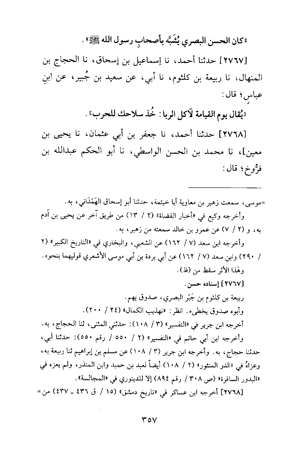 2767 - حَدَّثَنَا أَحْمَدُ، نا إِسْمَاعِيلُ بْنُ إِسْحَاقَ، نا الْحَجَّاجُ بْنُ الْمِنْهَالِ، نا رَبِيعَةُ بْنُ كُلْثُومٍ، نا أَبِي، عَنْ سَعِيدِ بْنِ جُبَيْرٍ، عَنِ ابْنِ عَبَّاسٍ؛ قَالَ: يُقَالُ يَوْمَ الْقِيَامَةِ لآكِلِ الرِّبَا: خُذْ سِلاحَكَ لِلْحَرْبِ