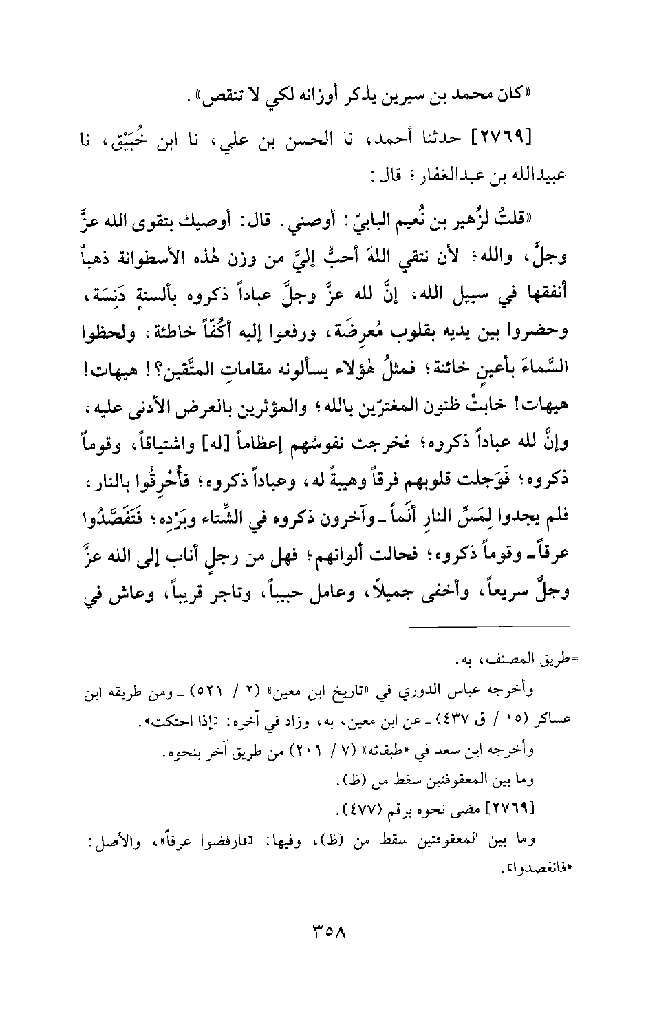 2769 - حَدَّثَنَا أَحْمَدُ، نا الْحَسَنُ بْنُ عَلِيٍّ، نا ابْنُ خُبَيْقٍ، نا عُبَيْدُ اللهِ بْنُ عَبْدِ الْغَفَّارِ؛ قَالَ: قُلْتُ لِزُهَيْرِ بْنِ نُعَيْمٍ الْبَابِيِّ: أَوْصِنِي. قَالَ: أُوصِيكَ بِتَقْوَى اللهِ عَزَّ وَجَلَّ، وَاللهِ! لأَنْ نَتَّقِيَ اللهَ أَحَبُّ إِلَيَّ مِنْ وَزْنِ هَذِهِ الأُسْطُوَانَةِ ذَهَبًا أُنْفِقُهَا فِي سَبِيلِ اللهِ، إِنَّ لِلَّهِ عَزَّ وَجَلَّ عِبَادًا ذَكَرُوهُ بِأَلْسِنَةٍ دَنِسَةٍ، وَحَضَرُوا بَيْنَ يَدَيْهِ بِقُلُوبٍ مُعْرِضَةٍ، وَرَفَعُوا إِلَيْهِ أَكُفًّا خَاطِئَةً، وَلَحِظُوُا السَّمَاءَ بِأَعْيُنٍ خَائِنَةٍ؛ فَمَثَلُ هَؤلاءِ يَسْأَلُونَهُ مَقَامَاتِ الْمُتَّقِينَ؟ ! هَيْهَاتَ! هَيْهَاتَ! خَابَتْ ظُنُونُ الْمُغْتَرِّينَ بِاللهِ؛ وَالْمُؤْثِرِينَ بِالْعَرَضِ الأَدْنَى عَلَيْهِ، وَإِنَّ لِلَّهِ عِبَادًا ذَكَرُوهُ؛ فَخَرَجَتْ نُفُوسُهُمْ إِعْظَامًا لَهُ وَاشْتِيَاقًا، وَقَوْمًا ذَكَرُوهُ؛ فَوَجِلَتْ قُلُوبُهُمْ فَرَقًا وَهَيْبَةً لَهُ، وَعِبَادًا ذَكَرُوهُ؛ فَأُحْرِقُوا بِالنَّارِ، فَلَمْ يَجِدُوا لِمَسِّ النَّارِ أَلَمًا، وَآخَرُونَ ذَكَرُوهُ فِي الشِّتَاءِ وَبَرْدِهِ؛ فَتَفَصَّدُوا عَرَقًا، وَقَوْمًا ذَكَرُوهُ؛ فَحَالَتْ أَلْوَانُهُمْ، فَهَلْ مِنْ رَجُلٍ أَنَابَ إِلَى اللهِ عَزَّ وَجَلَّ سَرِيعًا، وَأَخْفَى جَمِيلا، وَعَامَلَ حَبِيبًا، وَتَاجَرَ قَرِيبًا، وَعَاشَ -[359]- فِي الدُّنْيَا غَرِيبًا، وَقَدِمَ عَلَى اللهِ عَزَّ وَجَلَّ فَرْدًا وَحِيدًا؟ !