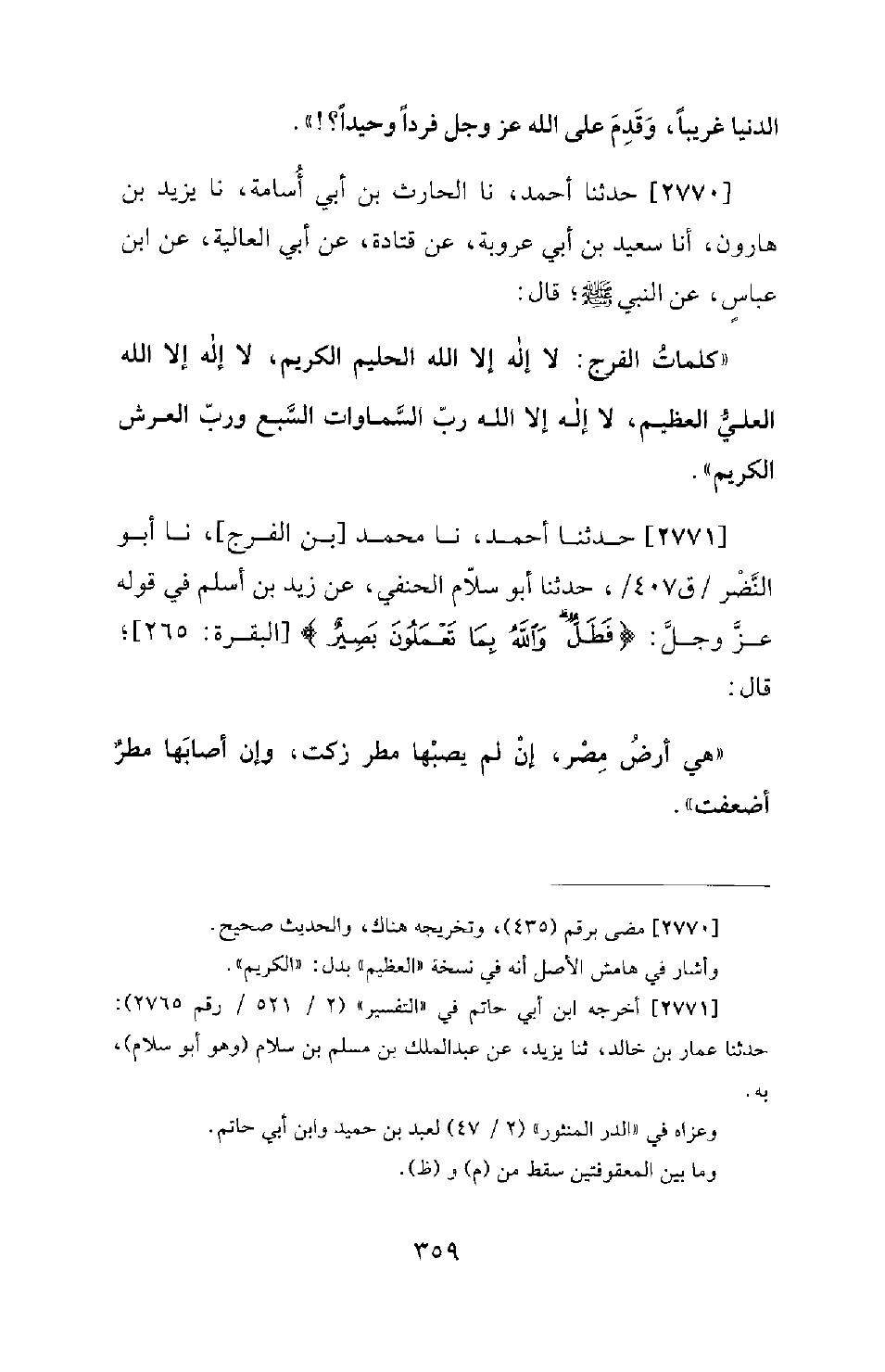 2770 - حَدَّثَنَا أَحْمَدُ، نا الْحَارِثُ بْنُ أَبِي أُسَامَةَ، نا يَزِيدُ بْنُ هَارُونَ، أَنَا سَعِيدُ بْنُ أَبِي عَرُوبَةَ، عَنْ قَتَادَةَ، عَنْ أَبِي الْعَالِيَةَ، عَنِ ابْنِ عَبَّاسٍ، عَنِ النَّبِيِّ صَلَّى اللَّهُ عَلَيْهِ وَسَلَّمَ؛ قَالَ: «كَلِمَاتُ الْفَرَجِ: لا إِلَهَ إِلا اللهُ الْحَلِيمُ الْكَرِيمُ، لا إِلَهَ إِلا اللهُ الْعَلِيُّ الْعَظِيمُ، لا إِلَهَ إِلا اللهُ رب السماوات السَّبْعِ وَرَبُّ الْعَرْشِ الْكَرِيمِ»