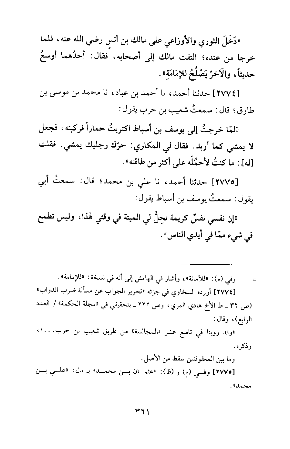 2774 - حَدَّثَنَا أَحْمَدُ، نا أَحْمَدُ بْنُ عَبَّادٍ، نا مُحَمَّدُ بْنُ مُوسَى بْنِ طَارِقٍ؛ قَالَ: سَمِعْتُ شُعَيْبَ بْنَ حَرْبٍ يَقُولُ: لَمَّا خَرَجْتُ إِلَى يُوسُفَ بْنِ أَسْبَاطٍ اكْتَرَيْتُ حِمَارًا فَرَكِبْتُهُ، فَجَعَلَ لا يَمْشِي كَمَا أُرِيدُ. فَقَالَ لِي الْمُكَارِيُّ: حَرِّكْ رَجْلَيْكَ يَمْشِي. فَقُلْتُ لَهُ: مَا كُنْتُ لأَحْمِلَهُ عَلَى أَكْثَرِ مِنْ طَاقَتِهِ.