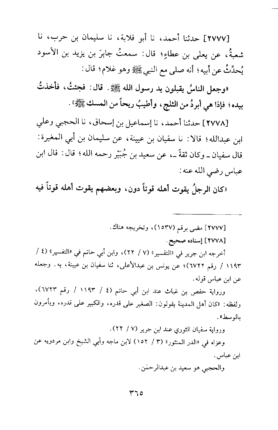 2777 - حَدَّثَنَا أَحْمَدُ، نا أَبُو قِلابَةَ، نا سُلَيْمَانُ بْنُ حَرْبٍ، نا شُعْبَةُ، عَنْ يَعْلَى بْنِ عَطَاءٍ؛ قَالَ: سَمِعْتُ جَابِرَ بْنَ يَزِيدَ بْنِ الأَسْوَدِ يُحَدِّثُ عَنْ أَبِيهِ؛ أَنَّهُ صَلَّى مَعَ النَّبِيِّ صَلَّى اللَّهُ عَلَيْهِ وَسَلَّمَ وَهُوَ غُلامٌ؛ قَالَ: وَجَعَلَ النَّاسُ يُقَبِّلُونَ يَدَ رَسُولِ اللهِ صَلَّى اللَّهُ عَلَيْهِ وَسَلَّمَ. قَالَ: فَجِئْتُ، فاخذت بِيَدِهِ؛ فَإِذَا هِيَ أَبْرَدُ مِنَ الثَّلْجِ، وَأَطْيَبُ رِيحًا مِنَ الْمِسْكِ؛ صَلَّى اللَّهُ عَلَيْهِ وَسَلَّمَ