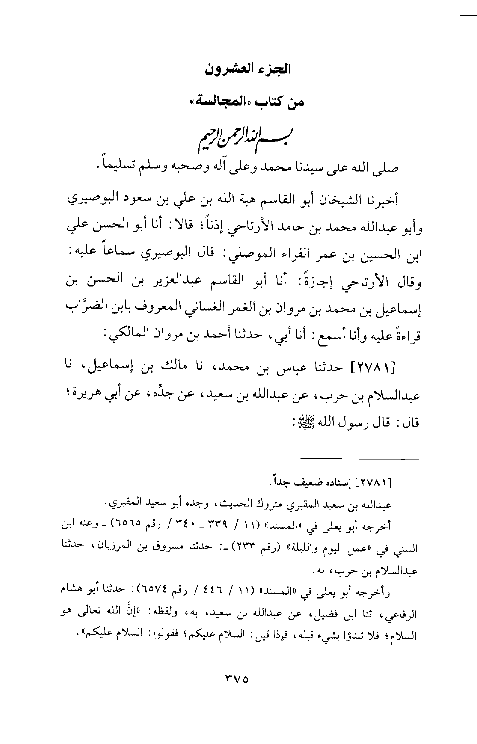 2781 - حَدَّثَنَا عَبَّاسُ بْنُ مُحَمَّدٍ، نا مَالِكُ بْنُ إِسْمَاعِيلَ، نا عَبْدُ السَّلامِ بْنِ حَرْبٍ، عَنْ عَبْدِ اللهِ بْنِ سَعِيدٍ، عَنْ جَدِّهِ، عَنْ أَبِي هُرَيْرَةَ؛ قَالَ: قَالَ رَسُولُ اللهِ -[376]- صَلَّى اللَّهُ عَلَيْهِ وَسَلَّمَ: «إِذَا أَرَادَ أَحَدُكُمُ السَّلامَ؛ فَلْيَقُلِ: السَّلامُ عَلَيْكُمْ؛ فَإِنَّ اللهَ هُوَ السَّلامُ، ولا تبدؤوا قَبْلَ اللهِ بِشَيْءٍ»