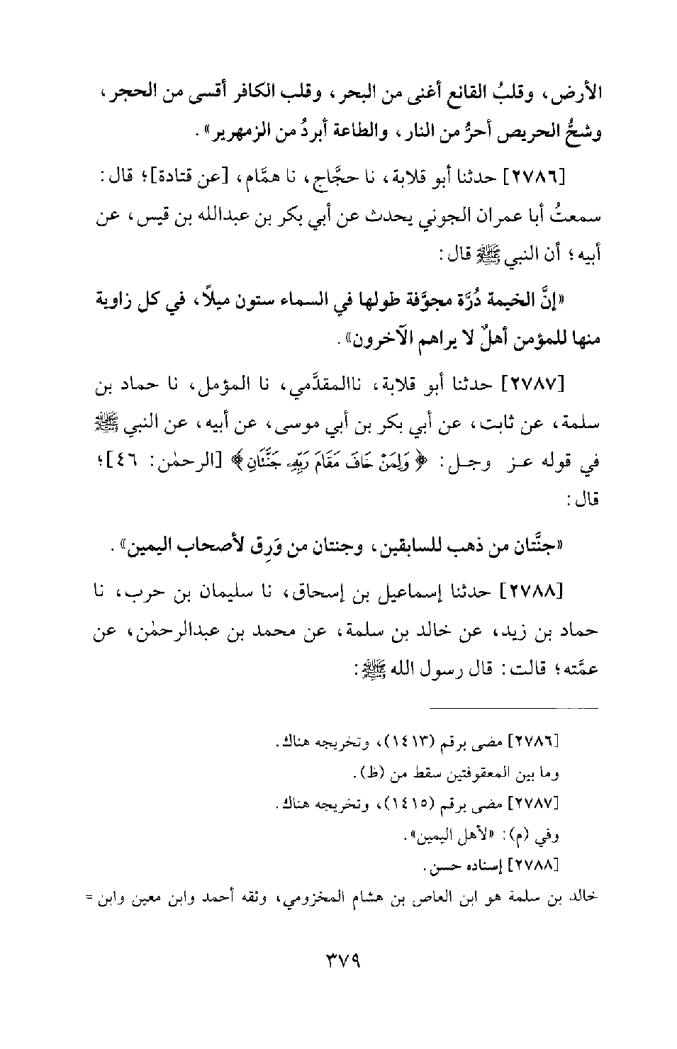 2786 - حَدَّثَنَا أَبُو قِلابَةَ، نا حَجَّاجُ، نا هَمَّامُ، عَنْ قَتَادَةَ؛ قَالَ: سَمِعْتُ أَبَا عِمْرَانَ الْجَوْنِيَّ يُحَدِّثُ عَنْ أَبِي بَكْرِ بْنِ عَبْدِ اللهِ بْنِ قَيْسٍ، عَنْ أَبِيهِ؛ أَنَّ النَّبِيَّ صَلَّى اللَّهُ عَلَيْهِ وَسَلَّمَ قَالَ: «إِنَّ الْخَيْمَةَ دُرَّةٌ مُجَوَّفَةٌ طُولُهَا فِي السَّمَاءِ سِتُّونَ مَيْلا، فِي كُلِّ زَاوِيَةٍ مِنْهَا لِلْمُؤْمِنِ أَهْلٌ لا يَرَاهُمُ الآخَرُونَ»