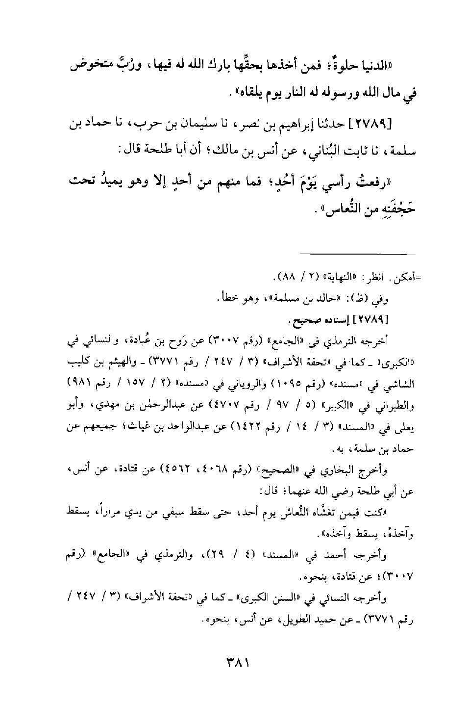 2789 - حَدَّثَنَا إِبْرَاهِيمُ بْنُ نَصْرٍ، نا سُلَيْمَانُ بْنُ حَرْبٍ، نا حَمَّادُ بْنُ سَلَمَةَ، نا ثَابِتٌ الْبُنَانِيُّ، عَنْ أَنَسِ بْنِ مَالِكٍ؛ أَنَّ أَبَا طَلْحَةَ قَالَ: رَفَعْتُ رَأْسِي يَوْمَ أُحُدٍ؛ فَمَا مِنْهُمْ مِنْ أَحَدٍ إِلا وَهُوَ يَمِيدُ تَحْتَ حَجَفَتِهِ مِنَ النُّعَاسِ