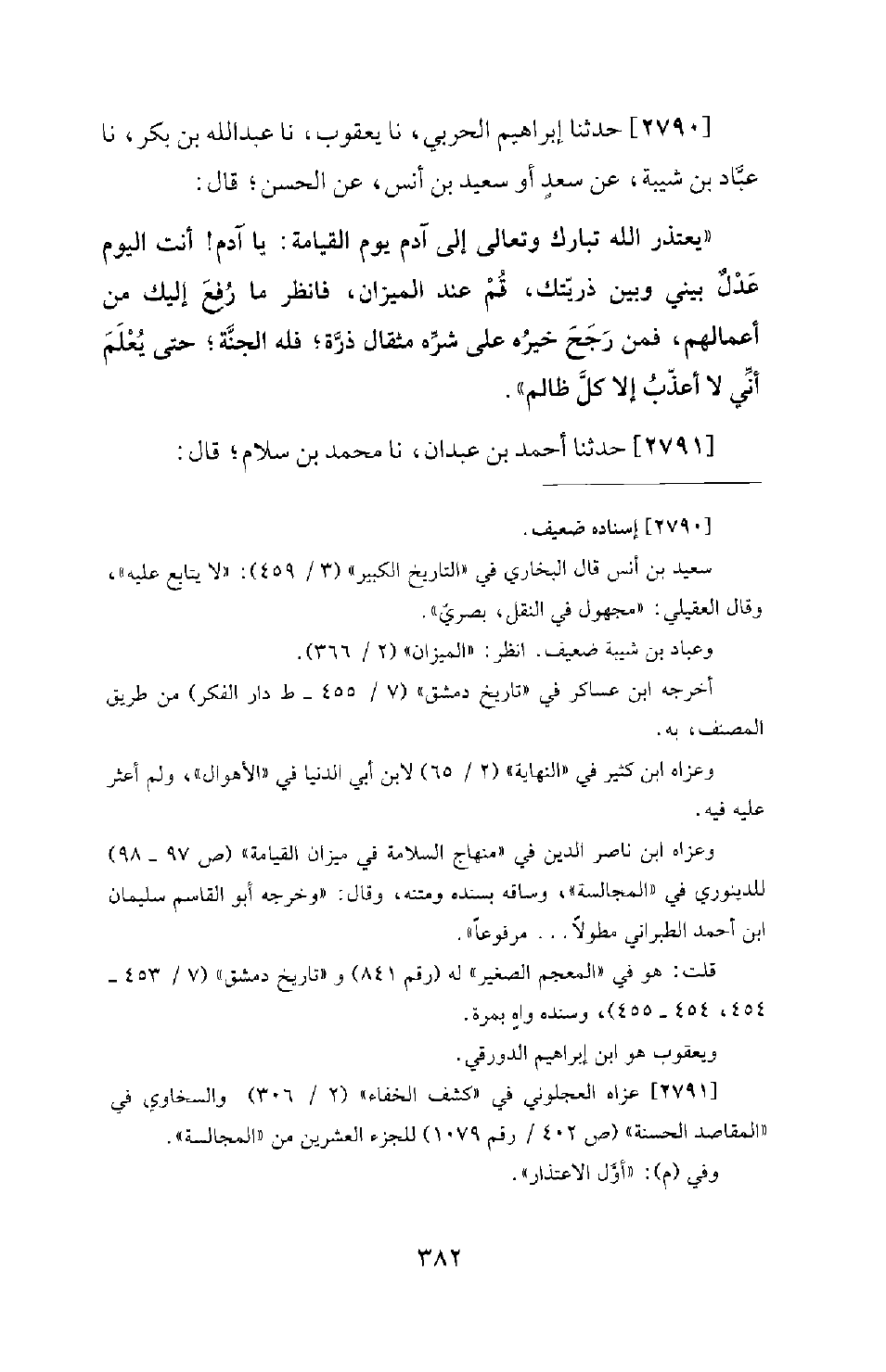 2790 - حَدَّثَنَا إِبْرَاهِيمُ الْحَرْبِيُّ، نا يَعْقُوبُ، نا عَبْدُ اللهِ بْنُ بَكْرٍ، نا عَبَّادُ بْنُ شَيْبَةَ، عَنْ سَعْدٍ أَوْ سَعِيدِ بْنِ أَنَسٍ، عَنِ الْحَسَنِ؛ قَالَ: يَعْتَذِرُ اللهُ تَبَارَكَ وَتَعَالَى إِلَى آدَمَ يَوْمَ الْقِيَامَةَ: يَا آدَمُ! أَنْتَ الْيَوْمَ عَدْلٌ بَيْنِي وَبَيْنَ ذُرِّيَّتِكَ، قُمْ عِنْدَ الْمِيزَانِ، فَانْظُرْ مَا رُفِعَ إِلَيْكَ مِنْ أَعْمَالِهِمْ، فَمَنْ رَجَحَ خَيْرُهُ عَلَى شَرِّهِ مِثْقَالَ ذَرَّةٍ؛ فَلَهُ الْجَنَّةُ؛ حَتَّى يُعْلَمَ أَنِّي لا أُعَذِّبُ إِلا كُلَّ ظَالِمٍ