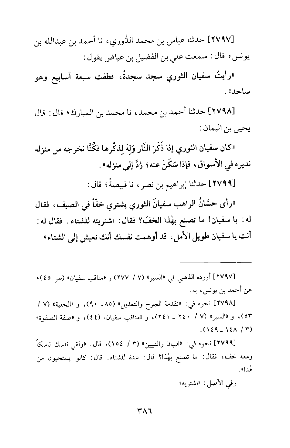 2799 - حَدَّثَنَا إِبْرَاهِيمُ بْنُ نَصْرٍ، نا قَبِيصَةُ؛ قَالَ: رَأَى حَسَّانٌ الرَّاهِبُ سُفْيَانَ الثَّوْرِيَّ يَشْتَرِي خُفًّا فِي الصَّيْفِ، فَقَالَ لَهُ: يَا سُفْيَانُ! مَا تَصْنَعُ بِهَذَا الْخُفِّ؟ فَقَالَ: اشْتَرِيتهِ لِلشِّتَاءِ. فَقَالَ لَهُ: أَنْتَ يَا سُفْيَانُ طَوِيلُ الأَمَلِ، قَدْ أَوْهَمْتَ نَفْسَكَ أَنَّكَ تَعِيشُ إِلَى الشِّتَاءِ.