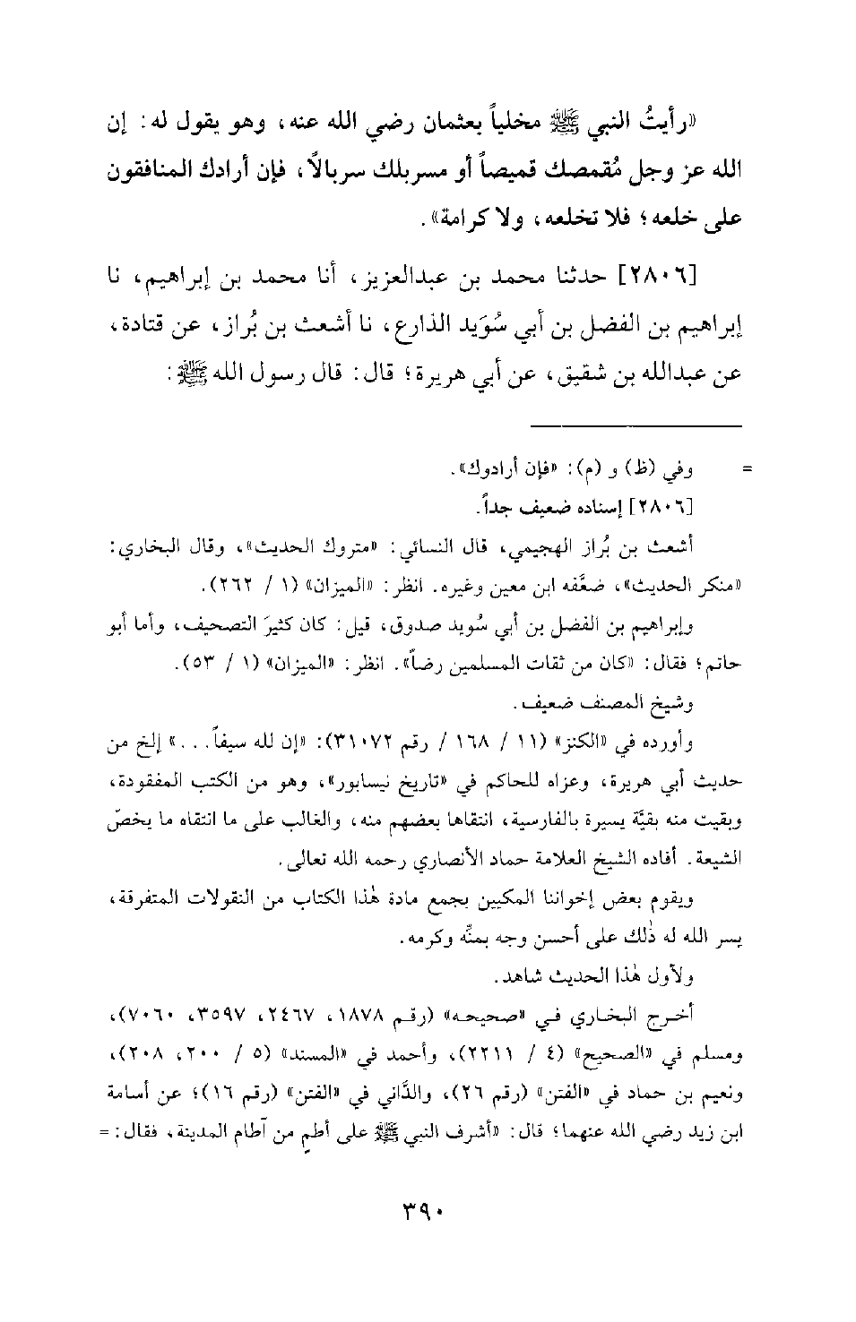 2806 - حَدَّثَنَا مُحَمَّدُ بْنُ عَبْدِ الْعَزِيزِ، أَنَا مُحَمَّدُ بْنُ إِبْرَاهِيمَ، نا إِبْرَاهِيمُ بْنُ الْفَضْلِ بْنِ أبي سويد الذارع، نا أَشْعَثُ بْنُ بُرَازٍ، عَنْ قَتَادَةَ، عَنْ عَبْدِ اللهِ بْنِ شَقِيقٍ، عَنْ أَبِي هُرَيْرَةَ؛ قَالَ: قَالَ رَسُولُ اللهِ -[391]- صَلَّى اللَّهُ عَلَيْهِ وَسَلَّمَ: «إِنِّي أَرَى الْفِتَنَ تَخَلَّلُ بُيُوتَكُمْ كَمَا يَتَخَلَّلُهَا الْمَطَرُ، إِنَّ لِلَّهِ عَزَّ وَجَلَّ سَيْفًا لا يَسُلُّهُ عَلَى أَحَدٍ، فَإِذَا سَلُّوهُ عَلَى أَنْفُسِهِمْ؛ لَمْ يُغْمَدْ إِلَى يَوْمِ الْقِيَامَةِ»