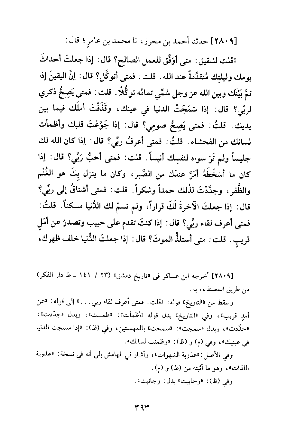 2809 - حَدَّثَنَا أَحْمَدُ بْنُ مُحْرِزٍ، نا مُحَمَّدُ بْنُ عَامِرٍ؛ قَالَ: قُلْتُ لِشَقِيقٍ: مَتَى أُوَفَّقُ لِلْعَمَلِ الصَّالِحِ؟ قَالَ: إِذَا جَعَلْتَ أَحْدَاثَ يَوْمِكَ وَلَيْلَتِكَ مُتَقَدِّمَةً عِنْدَ اللهِ. قُلْتُ: فَمَتَى أَتَوَكَّلُ؟ قَالَ: إِنَّ الْيَقِينَ إِذَا تَمَّ بَيْنَكَ وَبَيْنَ اللهِ عَزَّ وَجَلَّ سُمِّيَ تَمَامُهُ تَوَكُّلا. قُلْتُ: فَمَتَى يَصِحُّ ذِكْرِي لِرَبِّي؟ قَالَ: إِذَا سَمَجَتِ الدُّنْيَا فِي عَيْنِكَ، وَقَذَفْتَ أَمَلَكَ فِيمَا بَيْنَ يَدَيْكَ. قُلْتُ: فَمَتَى يَصِحُّ صَوْمِي؟ قَالَ: إِذَا جَوَّعْتَ قَلْبَكَ وَأَظْمَأْتَ لِسَانَكَ مِنَ الْفَحْشَاءِ. قُلْتُ: فَمَتَى أَعْرِفُ رَبِّي؟ قَالَ: إِذَا كَانَ اللهُ لَكَ جَلِيسًا وَلَمْ تَرَ سِوَاهُ لِنَفْسِكَ أَنِيسًا. قُلْتُ: فَمَتَى أُحِبُّ رَبِّي؟ قَالَ: إِذَا كَانَ مَا أَسْخَطَهُ أَمَرَّ عِنْدَكَ مِنَ الصَّبْرِ، وَكَانَ مَا يَنْزِلُ بِكَ هُوَ الْغُنْمُ وَالظَّفْرُ، وَجَدَّدْتَ لِذَلِكَ حَمْدًا وَشُكْرًا. قُلْتُ: فَمَتَى أَشْتَاقُ إِلَى رَبِّي؟ قَالَ: إِذَا جَعَلْتَ الآخِرَةَ لَكَ قَرَارًا، وَلَمْ تُسَمَّ لَكَ الدُّنْيَا مَسْكَنًا. قُلْتُ: فَمَتَى أَعْرِفُ لِقَاءَ رَبِّي؟ قَالَ: إِذَا كُنْتَ تُقْدِمُ عَلَى حَبِيبٍ وَتُصْدِرُ عَنْ أَمَلٍ قَرِيبٍ. قُلْتُ: مَتَى أَسْتَلِذُ الْمَوْتَ؟ قَالَ: إِذَا جَعَلْتَ الدُّنْيَا خَلَفَ ظَهْرِكَ، -[394]- وَجَعَلْتَ الآخِرَةَ نُصْبَ عَيْنِكَ، وَعَلِمْتَ أَنَّ اللهَ تَبَارَكَ وَتَعَالَى يَرَاكَ عَلَى كُلِّ حَالٍ، وَقَدْ أَحْصَى عَلَيْكَ الدَّقِيقَ وَالْجَلِيلَ. قُلْتُ: فَمَتَى أَكْتَفِي بِأَهْوَنِ الأَغْذِيَةِ؟ قَالَ: إِذَا عَرَفْتَ وَبَالَ الشَّهَوَاتِ غَدًا وَسُرْعَةَ انْقِطَاعِ عُذُوبَةِ اللَّذَّاتِ. قُلْتُ: مَتَى أُوثِرُ اللهَ وَلا أُوثِرُ عَلَيْهِ سِوَاهُ؟ قَالَ: إِذَا أَبْغَضْتَ فِيهِ الْحَبِيبَ، وَجَانَبْتَ فِيهِ الْقَرِيبَ.