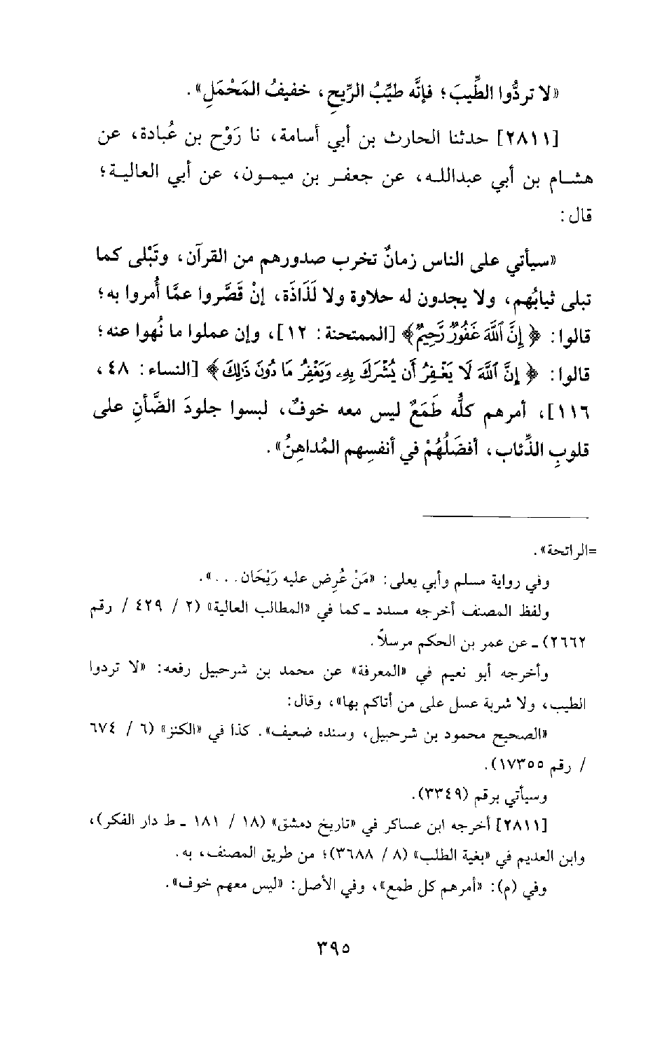 2811 - حَدَّثَنَا الْحَارِثُ بْنُ أَبِي أُسَامَةَ، نا رَوْحُ بْنُ عُبَادَةَ، عَنْ هِشَامِ بْنِ أَبِي عَبْدِ اللهِ، عَنْ جَعْفَرِ بْنِ مَيْمُونٍ، عَنْ أَبِي الْعَالِيَةِ؛ قَالَ: سَيَأْتِي عَلَى النَّاسِ زَمَانٌ تَخْرُبُ صُدُورُهُمْ مِنَ الْقُرْآنِ، وَتَبْلَى كَمَا تَبْلَى ثِيَابُهُمْ، وَلا يَجِدُونَ لَهُ حَلاوَةً وَلا لَذَاذَةً، إِنْ قَصَّرُوا عَمَّا أُمِرُوا بِهِ؛ قَالُوا: {إِنَّ اللهَ غَفُورٌ رَحِيمٌ} [الممتحنة: 12] ، وَإِنْ عَمِلُوا مَا نُهُوا عَنْهُ؛ قَالُوا: {إِنَّ اللهَ لا يَغْفِرُ أَنْ يُشْرَكَ بِهِ وَيَغْفِرُ مَا دُونَ ذلك} [النساء: 48، 116] ، أَمْرُهُمْ كُلُّهُ طَمَعٌ لَيْسَ مَعَهُ خَوْفٌ، لَبِسُوا جُلُودَ الضَّأْنِ عَلَى قُلُوبِ الذِّئَابِ، أَفْضَلُهُمْ فِي أَنْفُسِهِمُ الْمُدَاهِنُ.