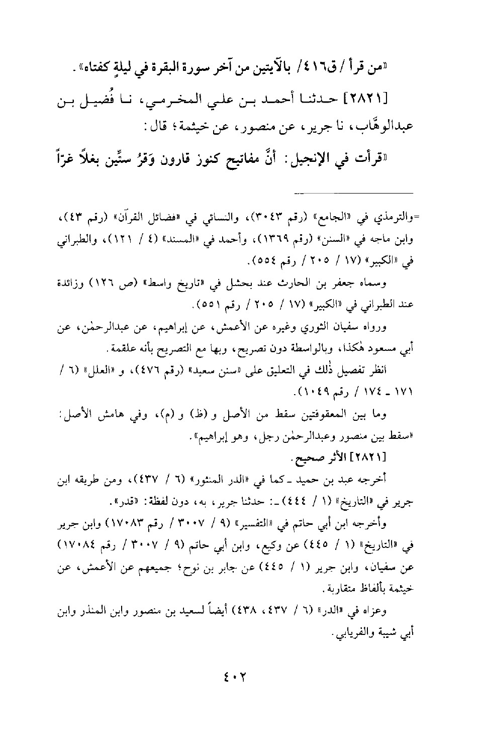 2821 - حَدَّثَنَا أَحْمَدُ بْنُ عَلِيٍّ الْمَخْرَمِيُّ، نا فُضَيْلُ بْنُ عَبْدِ الْوَهَّابِ، نا جَرِيرُ، عَنْ مَنْصُورٍ، عَنْ خَيْثَمَةَ؛ قَالَ: قَرَأْتُ فِي الإِنْجِيلِ: إن مَفَاتِيحَ كُنُوزِ قَارُونَ وَقْرُ سِتِّينَ بَغْلا غُرًّا -[403]- مُحَجَّلَةً، كُلُّ مِفْتَاحٍ مِنْهَا عَلَى قَدْرِ أُصْبُعٍ، لِكُلِّ مِفْتَاحٍ منها كنز (الأثر صحيح] .