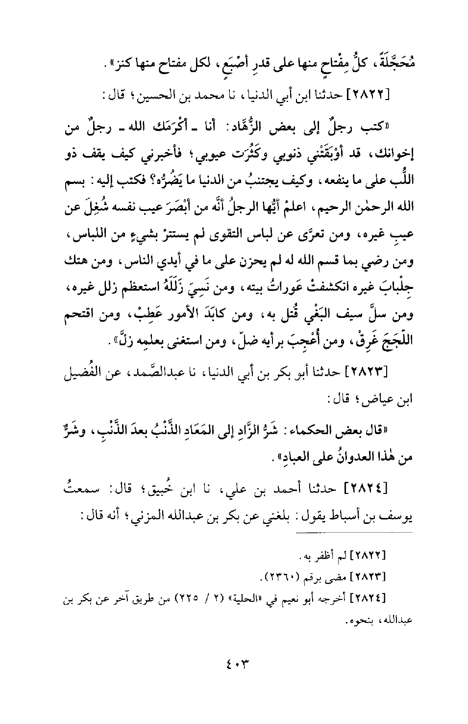 2822 - حَدَّثَنَا ابْنُ أَبِي الدُّنْيَا، نا مُحَمَّدُ بْنُ الْحُسَيْنِ؛ قَالَ: كَتَبَ رَجُلٌ إِلَى بَعْضِ الزُّهَّادِ: أَنَا - أَكْرَمَكَ اللهُ - رَجُلٌ مِنْ إِخْوَانِكَ، قَدْ أَوْبَقَتْنِي ذُنُوبِي وَكَثُرَتْ عُيُوبِي؛ فَأَخْبِرْنِي كَيْفَ يَقِفُ ذُو اللُّبِّ عَلَى مَا يَنْفَعُهُ، وَكَيْفَ يَجْتَنِبُ مِنَ الدُّنْيَا مَا يَضُرُّهُ؟ فَكَتَبَ إِلَيْهِ: بِسْمِ اللهِ الرَّحْمَنِ الرَّحِيمِ، اعْلَمْ أَيُّهَا الرَّجُلُ أَنَّهُ مَنْ أَبْصَرَ عَيْبَ نَفْسِهِ شُغِلَ عَنْ عَيْبِ غَيْرِهِ، وَمَنْ تَعَرَّى عَنْ لِبَاسِ التَّقْوَى لَمْ يَسْتَتِرْ بِشَيْءٍ مِنَ اللِّبَاسِ، وَمَنْ رَضِيَ بِمَا قَسَمَ اللهُ لَهُ لَمْ يَحْزَنْ عَلَى مَا فِي أَيْدِي النَّاسِ، وَمَنْ هَتَكَ جِلْبَابَ غَيْرَهُ انْكَشَفَتْ عَوْرَاتُ بَيْتِهِ، وَمَنْ نَسِيَ زَلَلَهُ اسْتَعْظَمَ زَلَلَ غَيْرِهِ، ومن سلم سَيْفَ الْبَغْيِ قُتِلَ، بِهِ وَمَنْ كَابَدَ الأُمُورَ عَطِبَ، وَمَنِ اقْتَحَمَ اللُّجَجَ غَرِقَ، وَمَنْ أُعْجِبَ بِرَأْيِهِ ضَلَّ، وَمَنِ اسْتَغْنَى بِعِلْمِهِ زَلَّ.