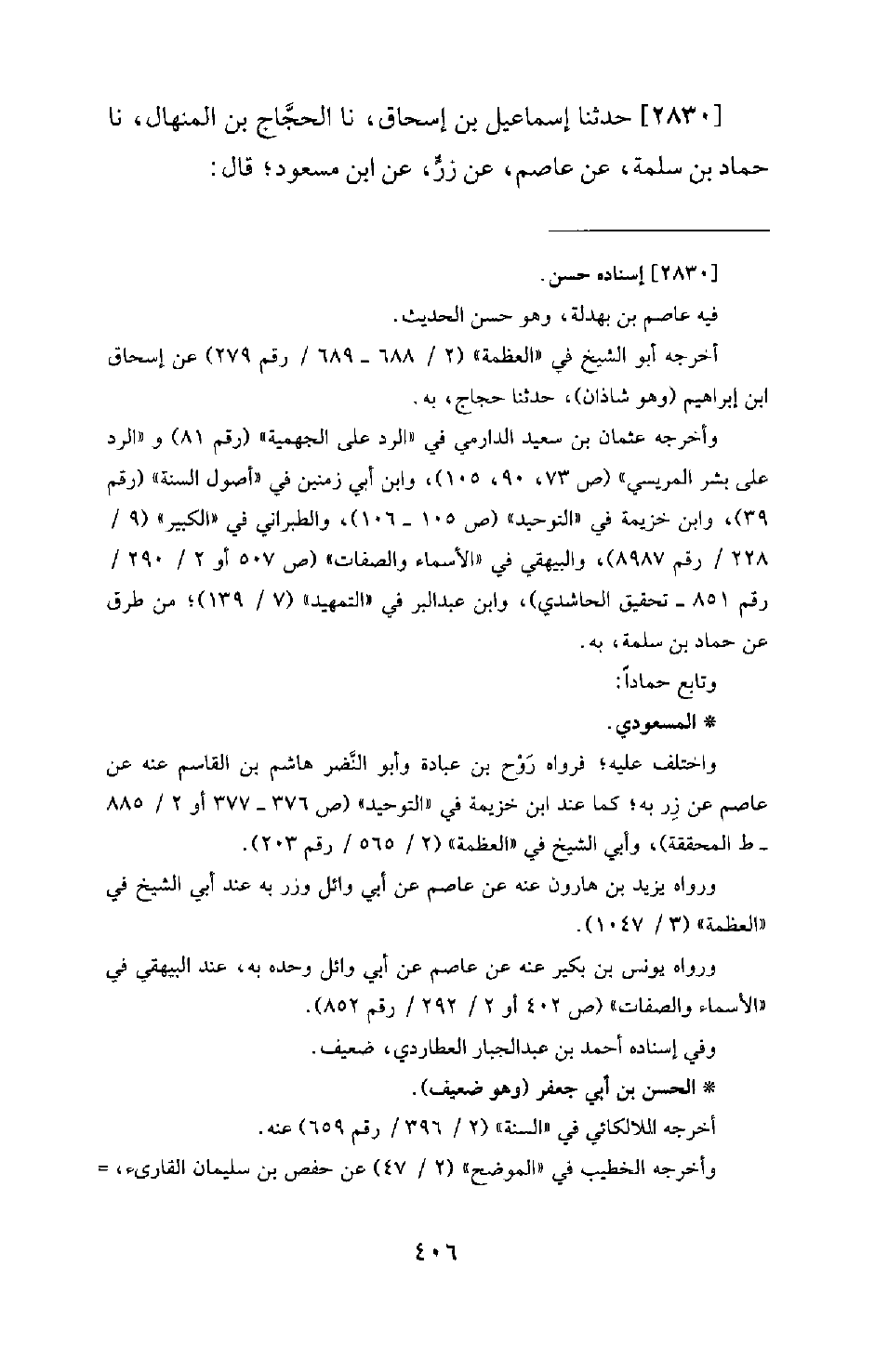 2830 - حَدَّثَنَا إِسْمَاعِيلُ بْنُ إِسْحَاقَ، نا الْحَجَّاجُ بْنُ الْمِنْهَالِ، نا حَمَّادُ بْنُ سَلَمَةَ، عَنْ عَاصِمٍ عَنْ زِرٍّ، عَنِ ابْنِ مَسْعُودٍ؛ قَالَ: -[407]- بَيْنَ سَمَاءِ الدُّنْيَا وَالَّتِي تَلِيهَا مَسِيرَةُ خَمْسِ مئة عَامٍ، وَبَيْنَ كُلِّ سَمَاءَيْنِ مسيرة خمس مئة عَامٍ، وَبَيْنَ السَّمَاءِ السَّابِعَةِ وَبَيْنَ الْكُرْسِيِّ مَسِيرَةُ خَمْسِ مئة عَامٍ، وَبَيْنَ الْكُرْسِيِّ وَبَيْنَ الماء مسيرة خمس مئة عَامٍ، وَالْعَرْشُ فَوْقَ الْمَاءِ، وَاللهُ تَبَارَكَ وَتَعَالَى فَوْقَ الْعَرْشِ، وَهُوَ يَعْلَمُ مَا أَنْتُمْ عَلَيْهِ