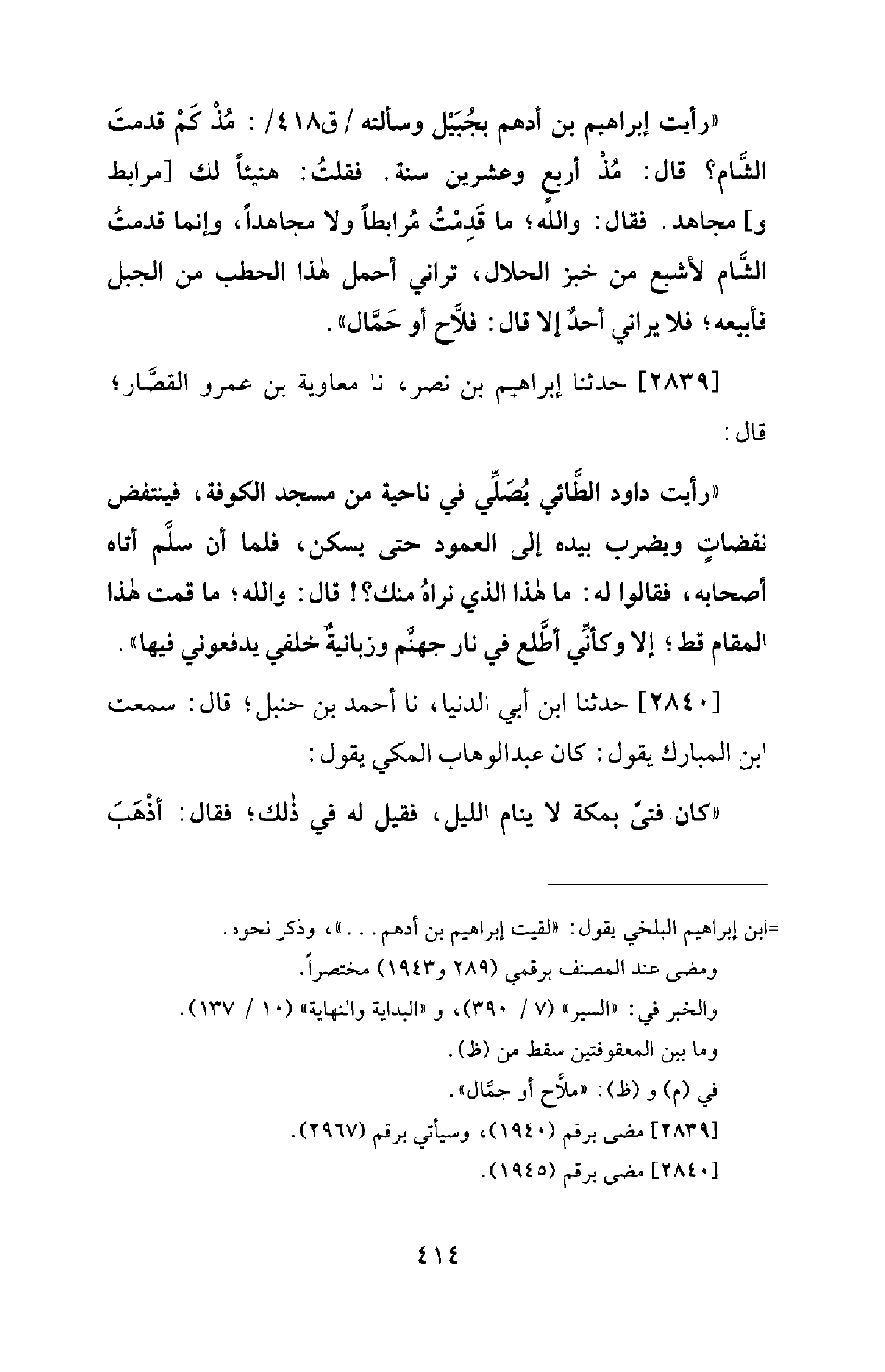 2839 - حَدَّثَنَا إِبْرَاهِيمُ بْنُ نَصْرٍ، نا مُعَاوِيَةُ بْنُ عَمْرٍو الْقَصَّارُ؛ قَالَ: رَأَيْتُ دَاوُدَ الطَّائِيَّ يُصَلِّي فِي نَاحِيَةٍ مِنْ مَسْجِدِ الْكُوفَةِ، فَيَنْتَفِضُ نَفَضَاتٍ وَيَضْرِبُ بِيَدِهِ إِلَى الْعَمُودِ حَتَّى يَسْكُنَ، فَلَمَّا أَنْ سَلَّمَ أَتَاهُ أَصْحَابُهُ، فَقَالُوا لَهُ: مَا هَذَا الَّذِي نَرَاهُ مِنْكَ؟ ! قَالَ: وَاللهِ! مَا قُمْتُ هَذَا الْمَقَامَ قَطُّ؛ إِلا وَكَأَنَّي أَطَّلِعُ فِي نَارِ جَهَنَّمَ وَزَبَانِيَةٌ خَلْفِي يَدْفَعُونِي فِيهَا.
